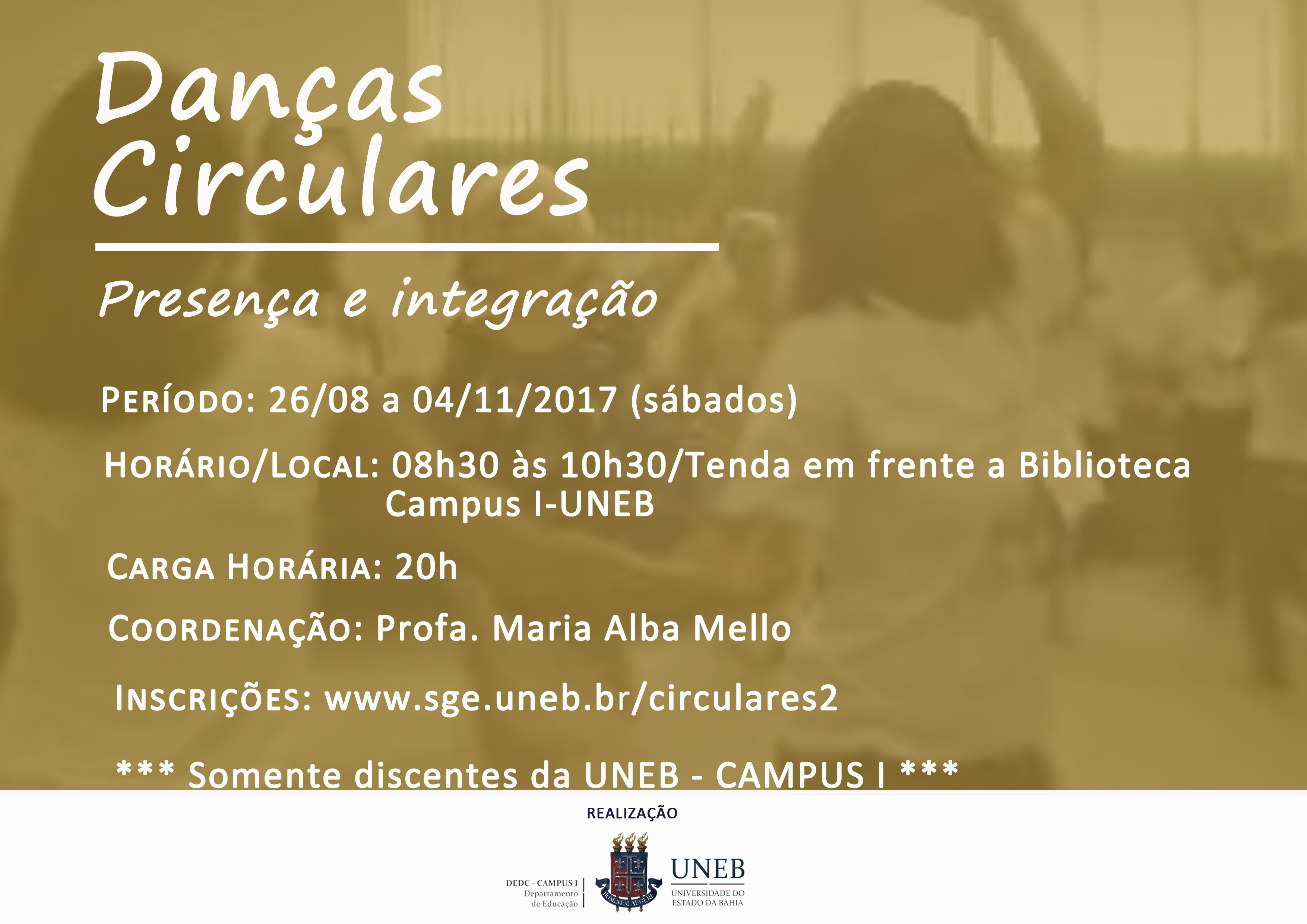 NUPE DEDC I Inscrição - 22/08/2017 à 26/08/2017As oficinas vivencias de Danças Circulares são compostas por danças rituais, em círculo, de diferentes povos (inclusive de nossos povos indígenas) e por danças coreografadas por dançarinas brasileiras com músicas tradicionais da nossa cultura como o chorinho, a ciranda etc.. OBJETIVO GERAL Difundir a linguagem artística da Dança como mecanismo de integração de grupos. OBJETIVOS ESPECIFICOS Desenvolver a integração grupal por meio de danças em círculo; Difundir danças sagradas e rituais de diversos povos, inclusive nossos indígenas; Contribuir para aprimorar diferentes formas de expressão dos nossos participantes.
