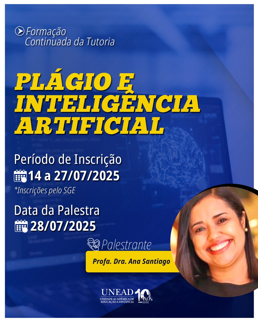 UNEAD Inscrição - 14/07/2025 à 28/07/2025A live "Plágio e IA" é uma das ações da Formação Continuada da Tutoria 2025.1 da UNEAD e tem como objetivo o fortalecimento do trabalho de tutoria. A formação será ministrada pela Profa. Dra. Ana Conceição Alves Santiago, no dia 28/07/2025, às 19h. A ação será transmitida no Canal do YouTube da UNEAD e poderá ser acessada em: https://www.youtube.com/watch?v=nCP2hkD6Puc. O evento é aberto à comunidade acadêmica e externa da UNEAD-UNEB, e as inscrições podem ser feitas pelo Sistema Gerenciador de Eventos (SGE) da universidade. A Formação Continuada é um evento semestral realizado pela UNEAD para apresentar, acolher e orientar tutores e profissionais de tutoria interessados em atuar na unidade. A live "Plágio e IA" é a última ação da formação no semestre 2025.1, que foi iniciada com o acolhimento dos tutores no início do semestre. A carga horária do evento será de 2 horas, e os participantes inscritos poderão obter certificado de participação.