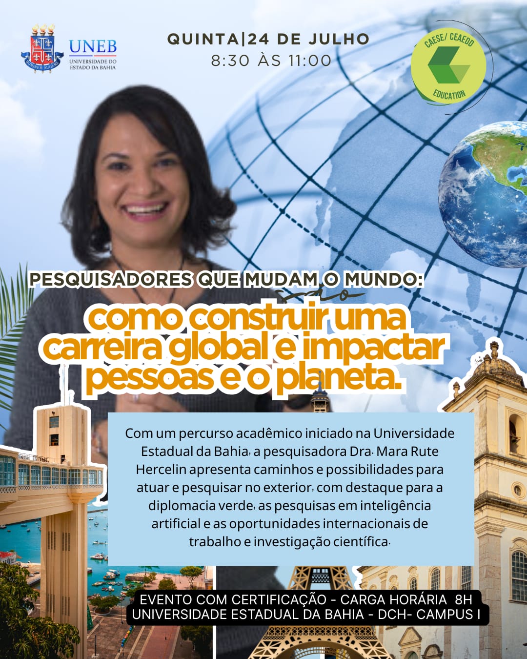DEDCXIII Inscrição - 11/07/2025 à 24/07/2025O evento “Pesquisadores que Mudam o Mundo: Como Construir uma Carreira Global e Impactar Pessoas e o Planeta” integra as ações do projeto de extensão “Acesso à Justiça”, desenvolvido no âmbito da Universidade Estadual da Bahia (UNEB). Com a participação da pesquisadora Dra. Mara Rute Hercelin, a atividade irá abordar caminhos e possibilidades para atuação acadêmica e profissional no exterior, destacando temas como diplomacia verde, inteligência artificial e pesquisas científicas de impacto global. A iniciativa visa estimular a comunidade acadêmica a refletir sobre o papel da ciência na construção de soluções sustentáveis e inclusivas, além de apresentar oportunidades de cooperação internacional em pesquisa e trabalho. Local: UNEB – Departamento de Ciências Humanas (DCH), Campus I Data: 24 de julho de 2025 Horário: 8h30 às 11h Carga horária: 4h (com certificação) O evento é gratuito, aberto ao público e faz parte das estratégias de internacionalização do projeto de extensão, alinhado ao compromisso da UNEB com a formação de profissionais capazes de atuar de forma ética e inovadora em escala local e global.