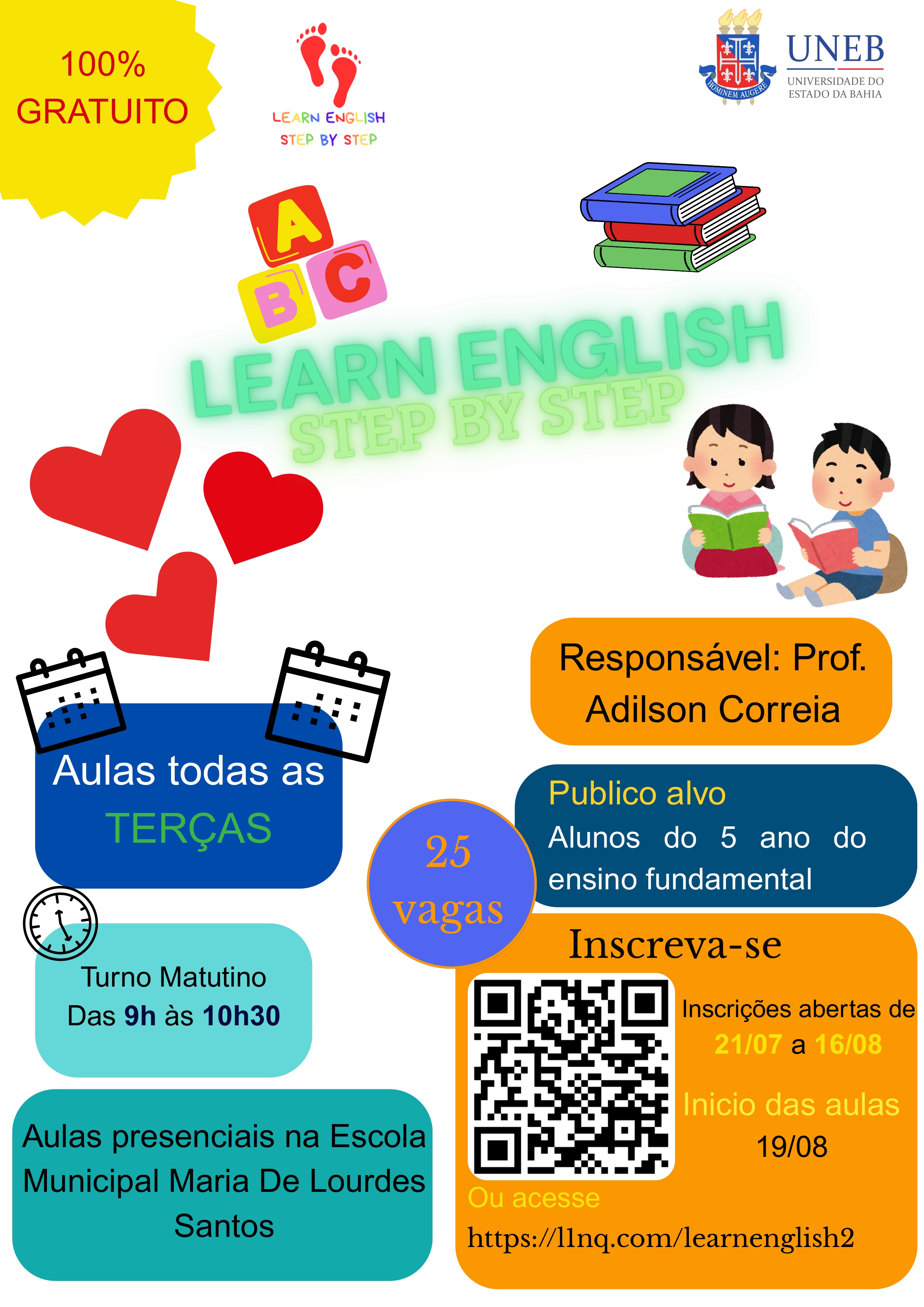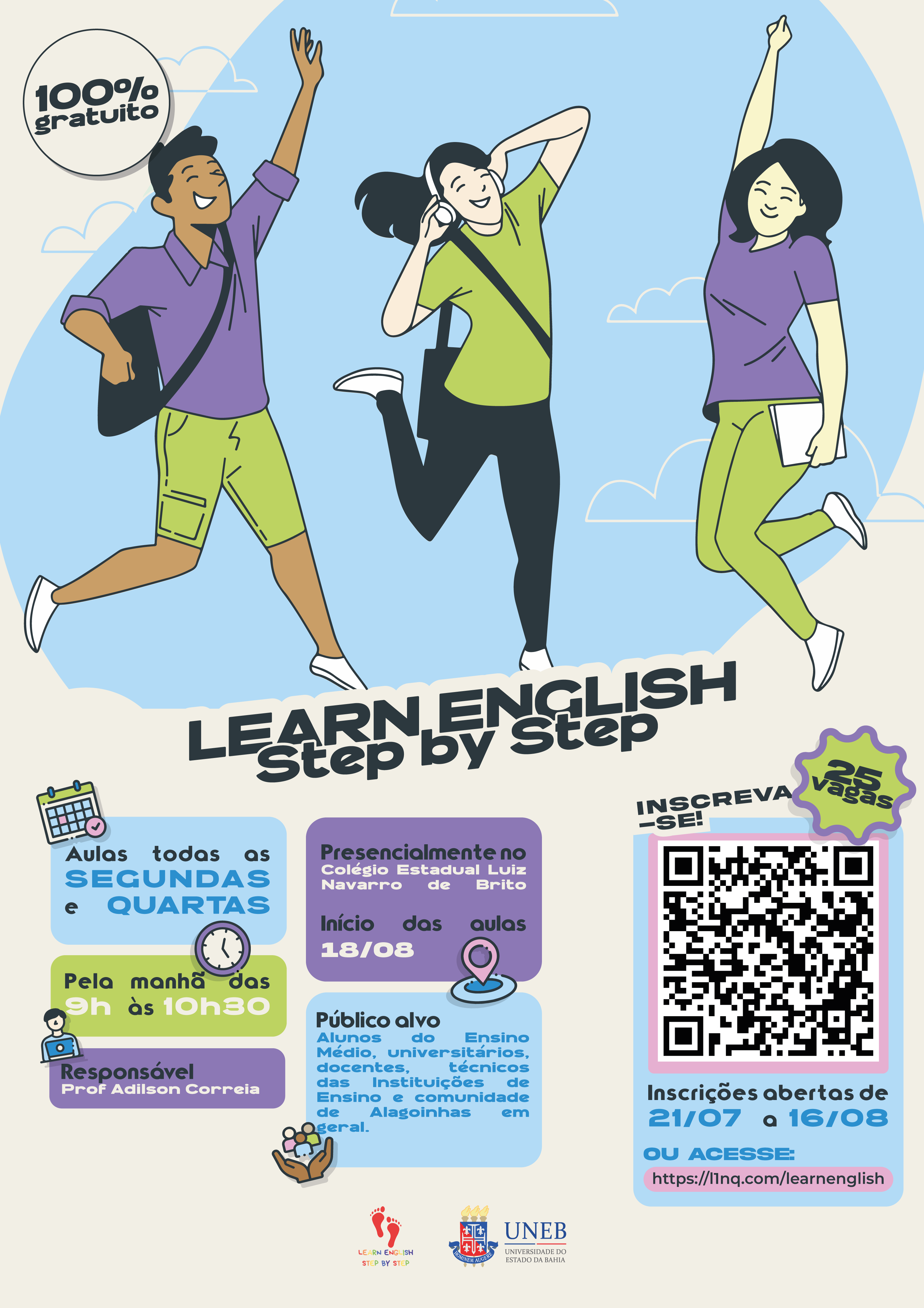 DLLARTES Inscrição - 21/07/2025 à 16/08/2025O curso de extensão Learn English step by step é voltado para a comunidade interessada em aprender inglês na perspectiva de iniciante. Neste curso, a abordagem é intercultural em que os alunos entrarão em contato com a língua inglesa com diversidade de material visando construir habilidades de oralidade e escrita em inglês como língua internacional.
