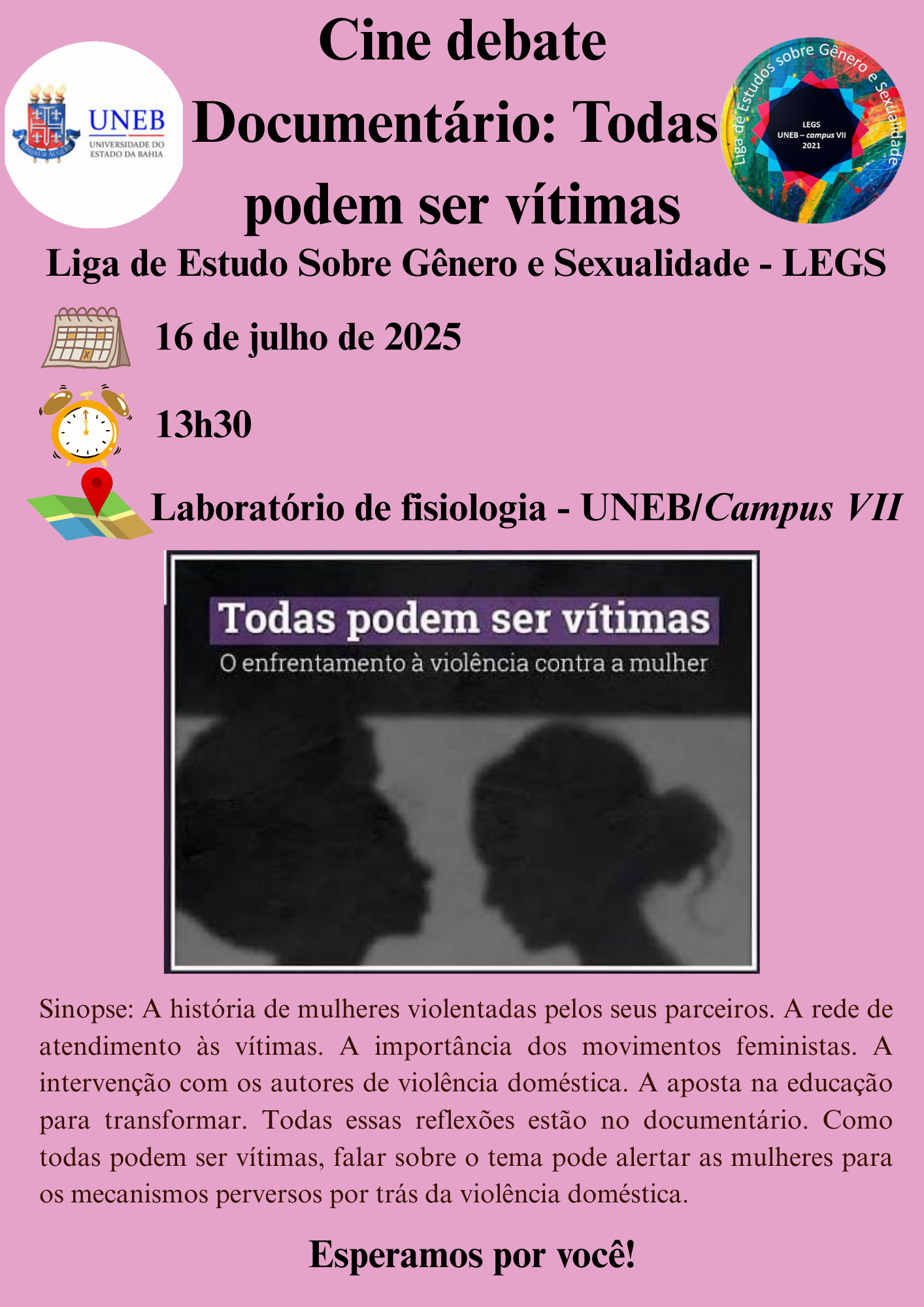 DEDCVII Inscrição - 14/07/2025 à 16/07/2025Cine debate do documentário "Todas podem ser vítimas" Produção da UnBTV revela a história de mulheres violentadas pelos seus parceiros. Como elas, milhares sofrem com relacionamentos abusivos. Todas podem ser vítimas, mas falar sobre o tema pode alertar as mulheres para os mecanismos perversos por trás da violência doméstica. Após a exibição do documentário haverá um debate sobre a temática. Participe!