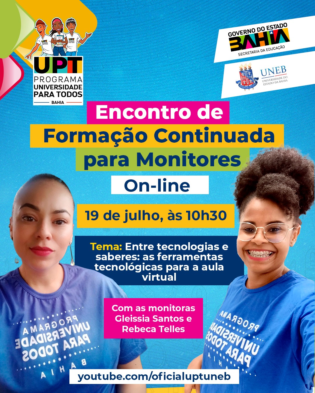Formação para a monitoria UPT - Entre tecnologias e saberes: as ferramentas tecnológicas para a aula virtual
