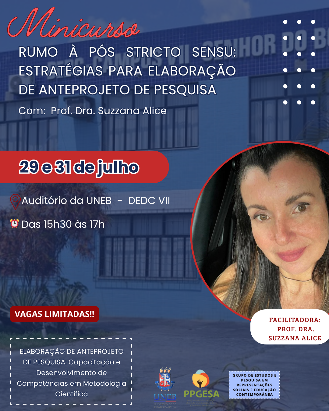 DEDCVII Inscrição - 23/07/2025 à 29/07/2025O minicurso “Rumo à Pós Stricto Sensu: Estratégias para Elaboração de Anteprojeto de Pesquisa” tem como objetivo oferecer orientações práticas e teóricas para a construção de anteprojetos acadêmicos, voltados à seleção em programas de pós-graduação. A ação será realizada presencialmente no auditório do DEDC VII/UNEB, entre os dias 29 e 31 de julho, com carga horária total de 10h e emissão de certificado para os participantes. A proposta busca ampliar o acesso à pós-graduação stricto sensu, especialmente entre estudantes e egressos da UNEB e da região do semiárido baiano.