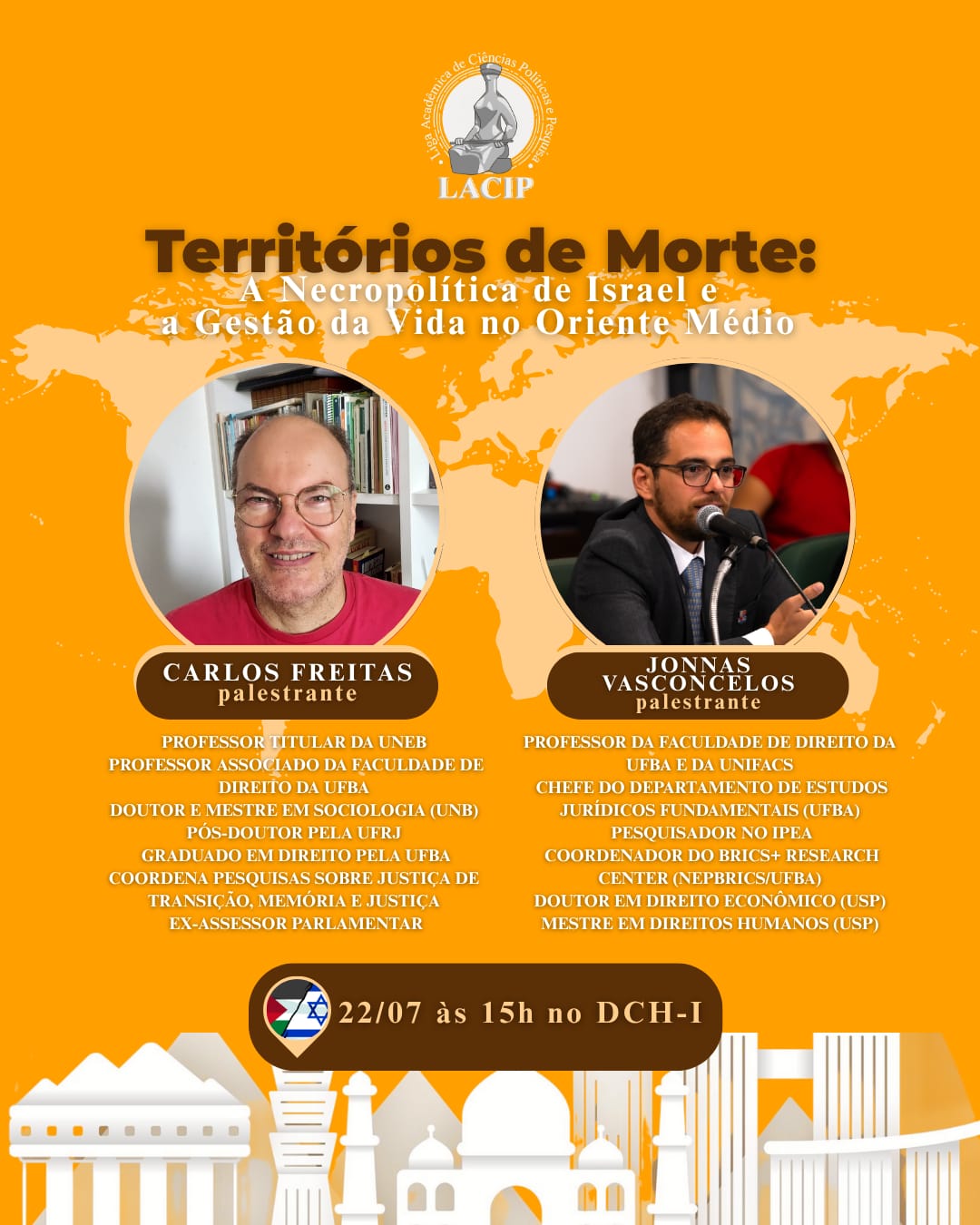 DCHI Inscrição - 22/07/2025 à 22/07/2025TERRITÓRIOS DE MORTE: a necropolítica de Israel e a gestão da vida no Oriente Médio A Liga Acadêmica de Ciência Política (LACiP) convida toda a comunidade acadêmica e o público em geral para refletir sobre as dinâmicas da necropolítica e os modos de gestão da vida e da morte no Oriente Médio contemporâneo. O debate contará com os professores Carlos Freitas (UNEB/UFBA) e Jonnas Vasconcelos (UFBA/Unifacs/IPEA), pesquisadores com ampla atuação nas áreas de direitos humanos, relações internacionais e justiça de transição. ?? 22/07 às 15h ?? DCH-I | Evento aberto ao público QUANTIDADE: ATÉ 50 PESSOAS.