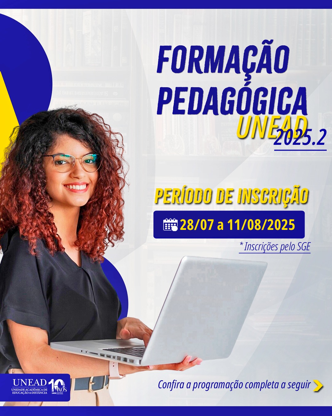 UNEAD Inscrição - 28/07/2025 à 14/08/2025A Formação Pedagógica UNEAD 2025.2, planejada pela Coordenação Geral da UNEAD e pelo Núcleo de Design Educacional da unidade, tem como principal objetivo a capacitação de tutores e professores formadores dos cursos de nível superior, na modalidade a distância, para a criação, desenvolvimento e acompanhamento de ambientes virtuais de aprendizagem no Moodle. A Formação Pedagógica visa proporcionar um aprendizado prático e interativo sobre os principais instrumentos utilizados na elaboração do planejamento de ensino de disciplinas, bem como desenvolver habilidades para interagir com as interfaces do Moodle. A ação, realizada semestralmente pela UNEAD, será transmitida no canal do YouTube da UNEAD e poderá ser acessada em: https://www.youtube.com/@UNEADUNEB/. O evento é aberto à comunidade interna e externa da UNEB, e as inscrições podem ser feitas pelo Sistema Gerenciador de Eventos (SGE) da universidade. A carga horária total do evento será de 20 horas, e os participantes inscritos poderão obter certificado ao final do curso. PROGRAMAÇÃO: Atividade Data/Horário Palestrante Link de acesso Abertura do evento Palestra Entre Desafios e Soluções: Reflexões sobre a Prática na EaD-UNEAD 11/08 19h às 21h Coordenação e NDE Gustavo Barreto Franco, Jeanderson Bulhões, Roberta Leal e Gilson Alves http://bit.ly/44PWDmZ Planejamento de Ensino na EAD e Principais configurações do AVA Unead 12/08 19h às 21h Marcio Palmeira e Leonardo Ferraz http://bit.ly/474W6Pr Inteligência Artificial e Educação: debates críticos e boas práticas na educação superior 13/08 19h às 21h Edméa Santos http://bit.ly/3UA1SkE O papel do Tutor no processo de aprendizagem multiletrada da EAD 14/08 19h às 21h Elaine Anjos dos Santos Beserra http://bit.ly/3UlGMGV