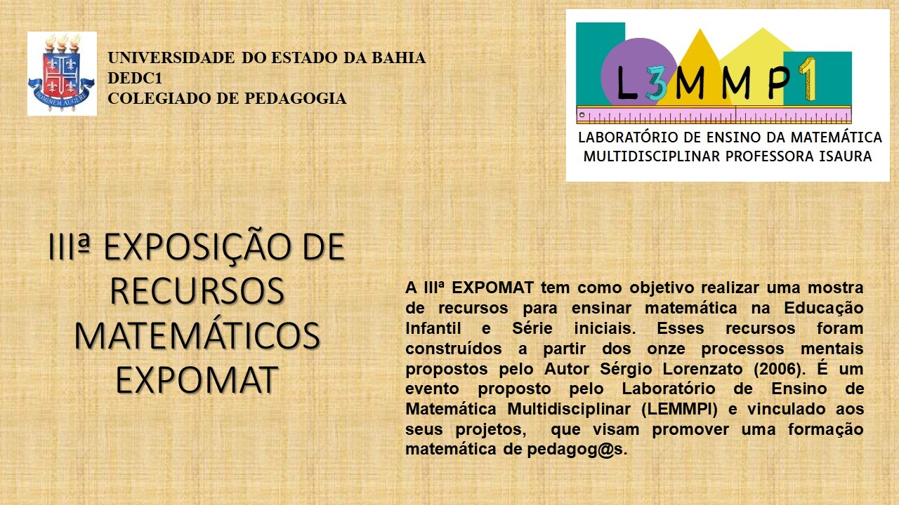 DEDCI Inscrição - 03/07/2025 à 06/07/2025A IIIª EXPOMAT tem como objetivo realizar uma mostra de recursos para ensinar matemática na Educação Infantil e Série iniciais. Esses recursos foram construídos a partir dos onze processos mentais propostos pelo Autor Sérgio Lorenzato (2006). É um evento proposto pelo Laboratório de Ensino de Matemática Multidisciplinar (LEMMPI) e vinculado aos seus projetos, que visam promover uma formação matemática de pedagog@s.