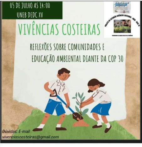 DEDC-XV Inscrição - 03/07/2025 à 05/07/2025No dia 05/07/2025, às 14h na UNEB (Campus XV) ocorrerá o seminário: "Reflexões sobre comunidades e educação ambiental diante da COP 30" é um momento de partilha das cartas rumo à COP 30 produzidas pelos discentes do componente Educação Ambiental, ofertado pelo Colegiado de Licenciatura em Pedagogia do Campus XV/UNEB e dos resultados iniciais do Projeto de extensão Vivências Costeiras, que consiste em um projeto de extensão vinculado ao DEDC 15 da UNEB e que tem como membros docente e discentes do Curso de Engenharia de Aquicultura em Alternância, em parceria com o grupo de pesquisa DOCFORM e comunidades ribeirinhas e costeiras.