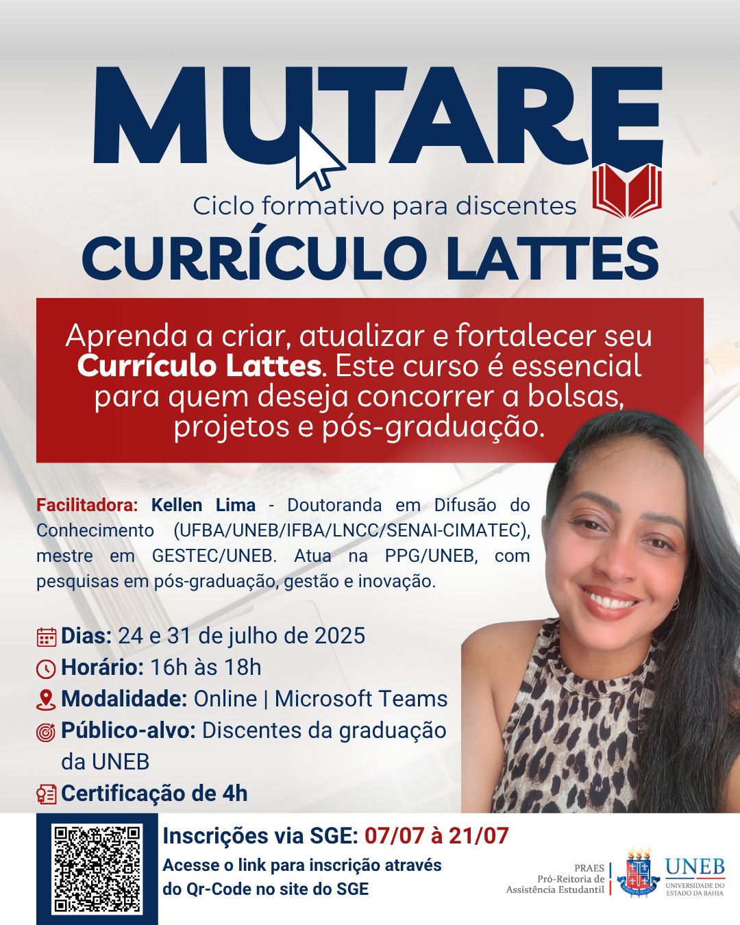 PRAES Inscrição - 07/07/2025 à 14/07/2025O Projeto Mutare, de caráter inovador, visa promover um ciclo de formações para discentes dos cursos de graduação da UNEB que desenvolva saberes e habilidades para a melhoria do desempenho acadêmico, das relações interpessoais e do exercício profissional futuro. Mutare expressa transformação e mudança. Neste sentido, a proposta do projeto pretende se constituir num movimento, num fluxo de mudança e transformações alicerçado na educação como pilar de qualificação, desenvolvimento, aprimoramento de habilidades, competências e saberes do quadro discente da UNEB, a partir de estratégias de formação por ciclos de conhecimento. Estas formações pretendem dialogar assim com os pressupostos de desenvolvimento pessoal e o incremento do conhecimento pluriversitário da UNEB, através de formações certificadas aos/as discentes.