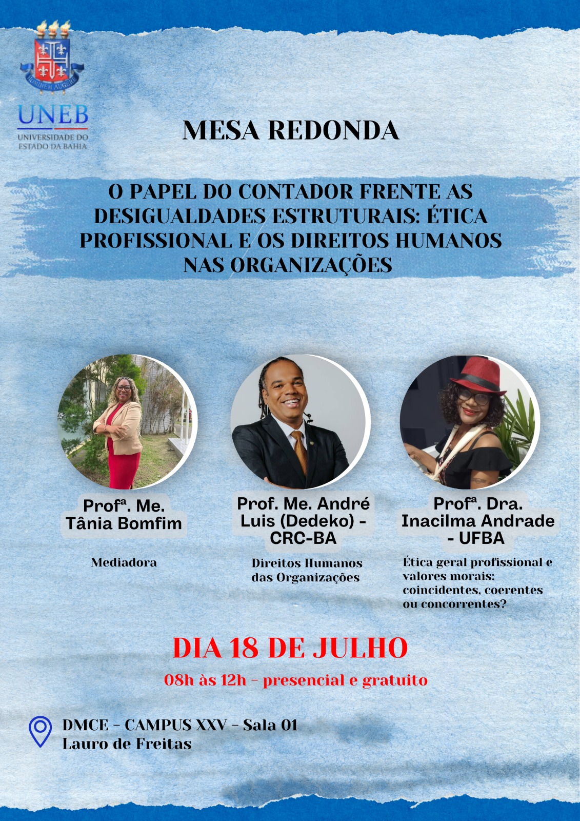 DCHTXIX Inscrição - 11/07/2025 à 18/07/2025O evento consiste numa ação extensionista e terá como tema " O PAPEL DO CONTADOR FRENTE AS DESIGUALDADES ESTRUTURAIS: ÉTICA PROFISSIONAL E OS DIREITOS HUMANOS NAS ORGANIZAÇÕES". A contabilidade não é neutra: ela reflete e influencia relações de pessoas e das organizações. Neste sentido, ao vincular direitos humanos e ética, a mesa redonda buscará desafiar a visão técnica tradicional da Contabilidade, destacando seu potencial para construir uma sociedade mais justa.