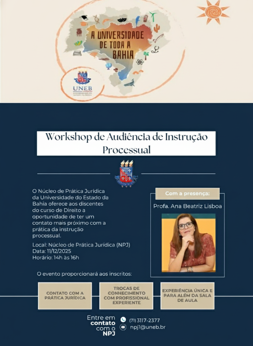 DCHI Inscrição - 18/11/2025 à 11/12/2025O Núcleo de Prática Jurídica do Curso de Direito promove o Workshop: Audiência de Instrução, atividade formativa dedicada ao desenvolvimento das competências práticas essenciais ao exercício da advocacia. O encontro abordará, de maneira direta e aplicada, as etapas que compõem a audiência de instrução, a condução estratégica do depoimento pessoal e da oitiva de testemunhas, além de orientações sobre postura profissional e técnicas de argumentação. Voltado aos estudantes que atuam no NPJ, o workshop busca fortalecer a segurança na participação em atos processuais, aproximando a vivência acadêmica da realidade forense e aperfeiçoando a preparação para a prática jurídica cotidiana.
