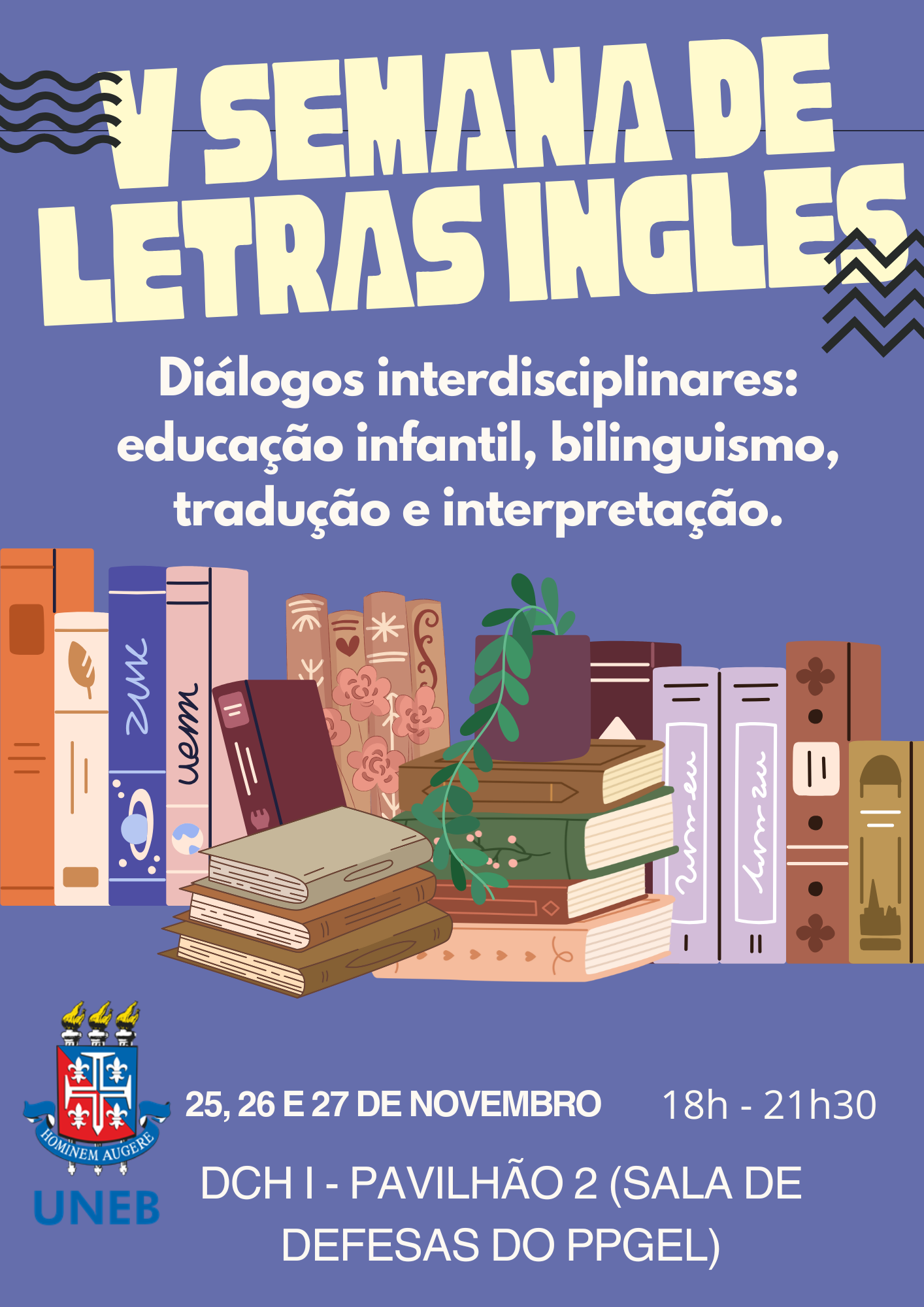 DCHI Inscrição - 24/11/2025 à 03/12/2025V Semana de Letras Inglês (25, 26 e 27 de novembro das 18h às 21h) Diálogos interdisciplinares: educação infantil, bilinguismo, tradução e interpretação Dia 1 25/11 terça-feira 18:00 - 18:15 Recepção (Monitores) 18:30 - 20:40 Minicurso: Estratégias e atividades para ensino de língua inglesa na educação infantil - Professora convidada Maria Barachisio Lisboa 20:40 - 21:00 Debate livre ………………………………………………………………….. Dia 2 26/11 quarta-feira 18:00 - 18:15 Recepção (Monitores) 18:20 - 19:10 Mesa temática: Entre línguas e sentidos: possibilidades de tradução e interpretação. Professora e Professor convidado: Feibriss Ametista Cassilhas e Bruno Almeida Mediação: Prof. Me. Paulo Esteves 19:10 - 19:40 Debate 19:45 - 21:00 Sessão de comunicação: Vozes da formação: experiências que inspiram (Host Profa Paula Montenegro) Luana Lopes de Queiros Souza - Vivências de Estágio Yasmim Barbosa Nunes - Heranças do Mar em The Camino Voyage, de Donal O’ceilleachair (2018) Gabriel Amarante de Sena - Uma proposta de tradução de “The tragical death of Aife’s only son” e “The Abbot of Drimnagh” José Luiz Dorea de Oliveira Muniz - O fantástico em O Rei de Amarelo, de Robert W. Chambers (1895) Flor Soares de Lima Valverde - A categorização e a conceptualização metafórica no ato de 8 de janeiro de 2023 em jornais estadunidenses: uma análise sob a perspectiva da linguística cognitiva ……………………………………………………. Dia 3 27/11 quinta-feira 18:00 -18:15 - Recepção (Monitores) 18:20 - 19:20 Palestra da convidada Naiara Felipe: “Uma tal Educação Bilíngue: compartilhando experiências, expectativas e realidades em contexto situado. 19:20 - 20:00 Debate 20:00 - 21:30 - Confraternização