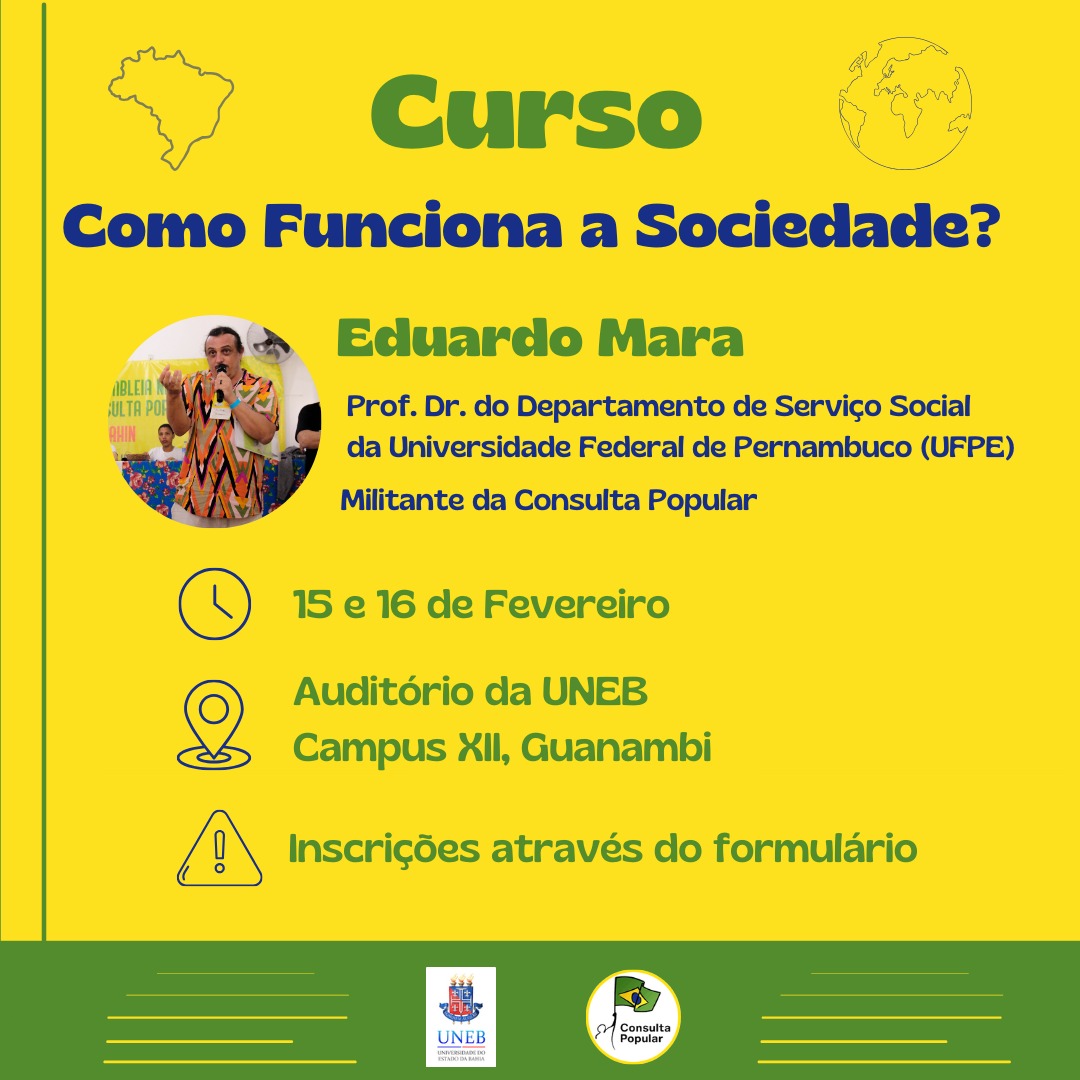 DEDCXII Inscrição - 27/01/2025 à 09/02/2025O presente projeto “CFS 1- Como Funciona a Sociedade”, trata-se de um curso de formação, a ser realizado em dois dias inteiros, em 15 e 16 de fevereiro, com estudantes de cursos de graduação, a ser realizado no Campus XII da UNEB, em Guanambi. A metodologia utilizada será a da Educação Popular, cuja perspectiva é de que o conhecimento pode ser traduzido e construído com interação e participação ativa de educador/a e educandos/as. Serão utilizados como recursos pedagógicos, quadro, cartolina, bem como serão desenvolvidas dinâmicas e encenações teatrais, como forma de promover a interação e participação na construção do conhecimento. Serão abordados temas que possibilitem o conhecimento sobre a economia, o Estado, a política e os processos sociais relacionados. O curso será realizado em dois dias intensivos, adotando a metodologia da Educação Popular, que promove a construção coletiva e a tradução do conhecimento por meio de uma interação ativa entre educadores/as e educandos/as. Para garantir o engajamento e a efetividade do aprendizado, serão utilizadas dinâmicas participativas que incentivem a colaboração e a reflexão conjunta, exposições dialogadas que estimulem o pensamento crítico, e recursos pedagógicos como quadro e cartolina. Além disso, encenações teatrais serão incorporadas como estratégia para tornar o processo de aprendizagem mais dinâmico e contextualizado. Palestrante Convidado: Eduardo Mara Professor Adjunto do Departamento de Serviço Social da Universidade Federal de Pernambuco (UFPE) Programação: * 15/02 Manhã: dinâmica de reconhecimento da realidade brasileira; Tarde: categorias básicas da economia política; * 16/02 Manhã: O papel da política e do Estado; Tarde: racismo, patriarcado e transformação social.