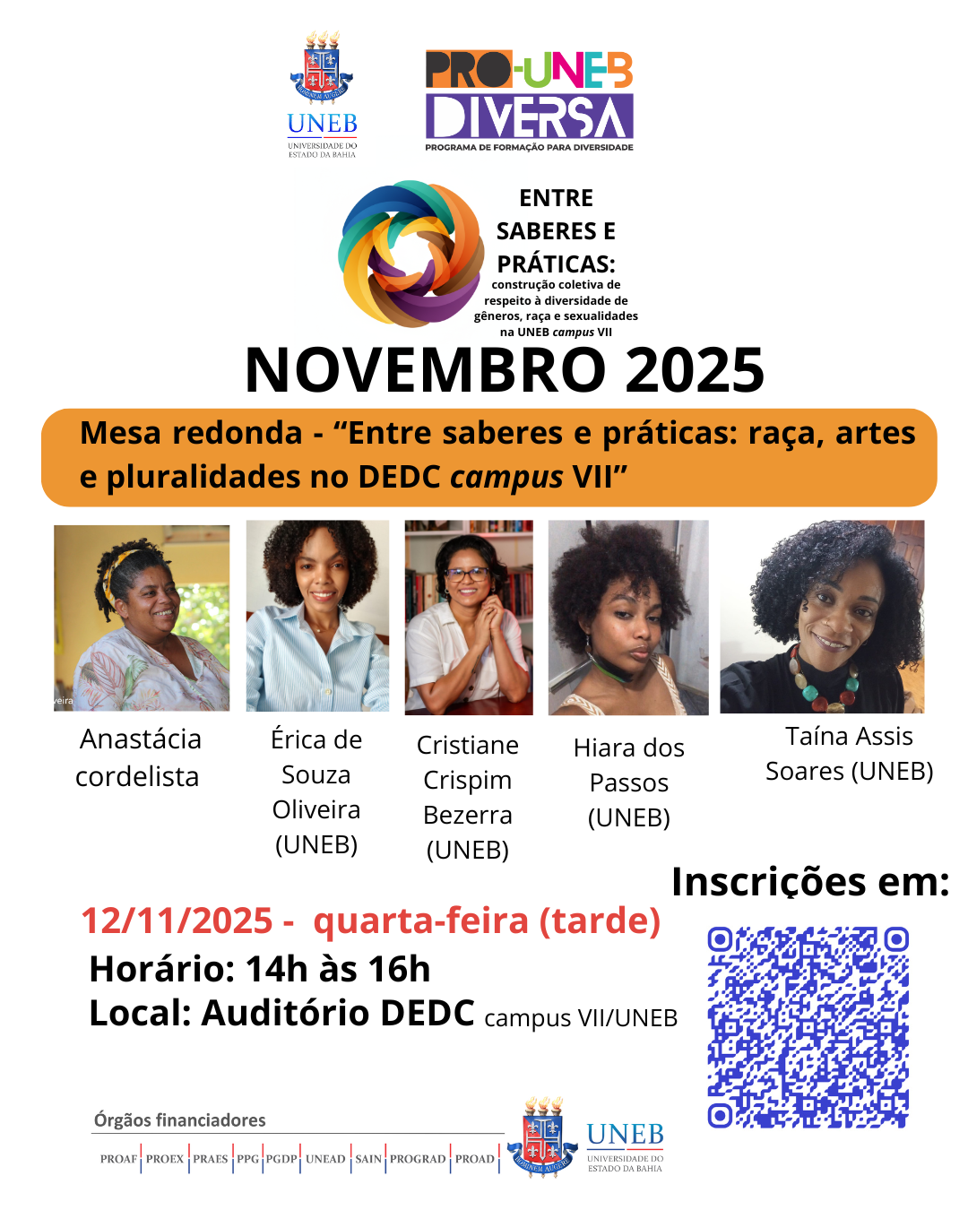 DEDCVII Inscrição - 06/11/2025 à 13/11/2025O evento “Entre Saberes e Práticas: gêneros, sexualidades e diversidade” objetiva apoiar a construção coletiva de uma cultura universitária antidiscriminatória, equitativa e acolhedora, comprometida com o respeito às diversidades sexuais, de raça e de gênero. A mesa-redonda será realizada no dia 12 de NOVEMBRO de 2025, das 14h às 16h, no auditório do DEDC Campus VII da UNEB, e constitui-se como um convite aberto a toda a comunidade acadêmica, incluindo docentes, discentes da graduação e pós-graduação e técnicos dos cursos de Teatro, Ciências Contábeis, Ciências Biológicas, Enfermagem, Matemática e Pedagogia. Por meio da integração entre diferentes áreas do conhecimento, o encontro busca fortalecer o diálogo interdisciplinar e intersetorial, reconhecendo que a promoção da diversidade e da equidade demanda a participação conjunta das ciências humanas, exatas e biológicas, assim como o engajamento técnico e pedagógico de toda a comunidade universitária. Essa articulação é essencial para consolidar práticas e saberes que contribuam para a transformação social e institucional em direção a uma UNEB mais inclusiva e plural. Destaca-se que o evento integra as ações de um projeto apoiado pelo Edital nº 067/2025 – PRO-UNEB Diversa, um edital multissetorial desenvolvido pela Pró-Reitoria de Ações Afirmativas (PROAF), em articulação com as Pró-Reitorias de Gestão e Desenvolvimento de Pessoas (PGDP), de Ensino de Graduação (PROGRAD), de Pesquisa e Ensino de Pós-Graduação (PPG), de Extensão (PROEX), de Assistência Estudantil (PRAES) e de Administração (PROAD), além da Secretaria de Acessibilidade e Inclusão (SAIN) e da Unidade Acadêmica de Educação a Distância (UNEAD).