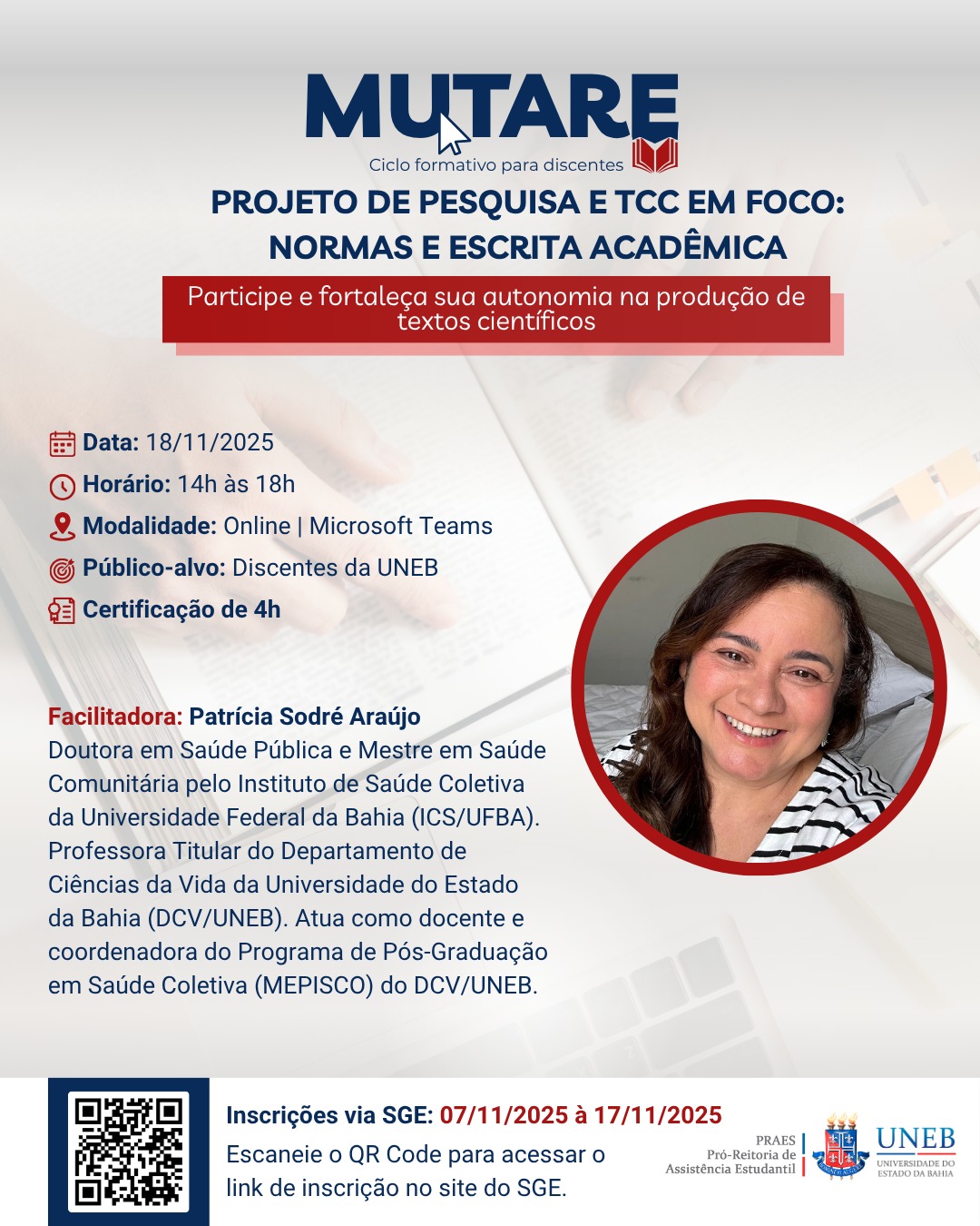 PRAES Inscrição - 07/11/2025 à 17/11/2025O Projeto Mutare promove formações em ciclos de conhecimento, voltadas ao desenvolvimento pessoal e acadêmico dos estudantes. Desenvolvido pela UNEB, por meio da da Pró-Reitoria de Assistência Estudantil (PRAES), o projeto busca fortalecer habilidades, competências e saberes. Nesse sentido, o ciclo de conhecimento “Projeto de Pesquisa e TCC em foco: normas e escrita acadêmica” tem como propósito auxiliar na compreensão dos elementos estruturais de projetos de pesquisa e Trabalhos de Conclusão de Curso, na aplicação das normas técnicas acadêmicas e no aprimoramento da escrita científica. Com uma abordagem teórico-prática em formato on-line, a atividade busca fortalecer a autonomia dos participantes na elaboração de textos acadêmicos claros, coerentes e normatizados. Data/Horário: 18/11/2025, 14h às 18h Carga horária total: 4 horas (com certificação) Facilitadora: Professora Patrícia Sodré Araújo Doutora em Saúde Pública com concentração em Planificação e Gestão em Serviços de Saúde. Mestre em Saúde Comunitária pelo Instituto de Saúde Coletiva da Universidade Federal da Bahia (ICS/UFBA). Professora Titular do Departamento de Ciências da Vida da Universidade do Estado da Bahia (DCV/UNEB). Coordena projetos de pesquisa na graduação e pós-graduação e atua como docente e coordenadora do Programa de Pós-Graduação em Saúde Coletiva (MEPISCO) do DCV-UNEB.