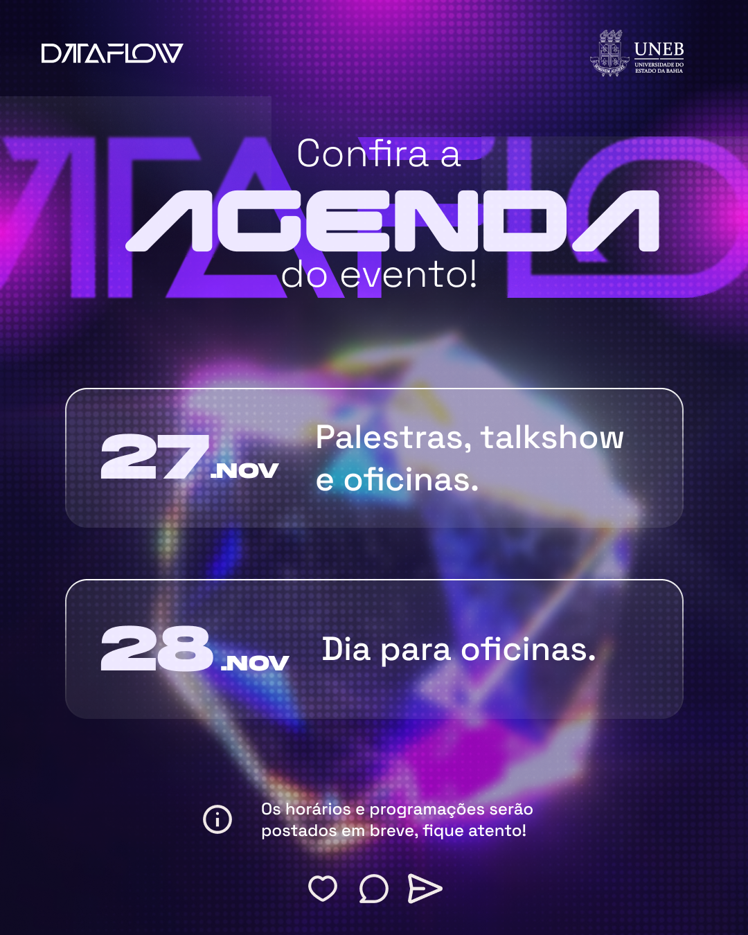 DCETII Inscrição - 07/11/2025 à 28/11/2025O DATAFLOW é um evento que convida você para mergulhar no universo da Ciência de Dados, a área que transforma informação em conhecimento e inovação. Este evento reunirá especialistas, pesquisadores, estudantes e curiosos na área para discutir tendências, aplicações práticas e os desafios do futuro em inteligência artificial, big data e análise. Uma oportunidade única de aprender, trocar experiências e se conectar com quem está moldando o amanhã da tecnologia.