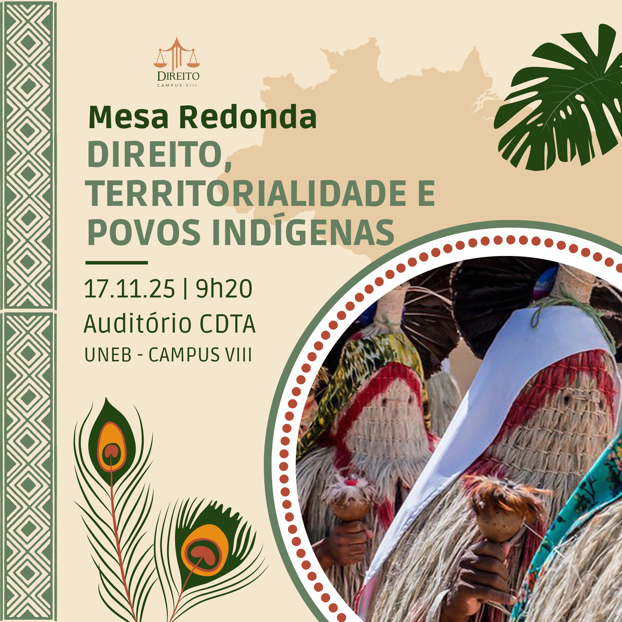 DEDCVIII Inscrição - 10/11/2025 à 16/11/2025O Colegiado de Direito do Campus VIII da UNEB tem a honra de convidar a comunidade acadêmica e o público em geral para a Mesa Redonda Direito, Territorialidade e Povos Indígenas. Um evento imperdível que promove um diálogo profundo e necessário sobre os direitos indígenas, a proteção territorial e as intersecções com o ordenamento jurídico brasileiro. NOSSOS COVIDADOS Elisa Urbano. Mestre e Doutoranda em Antropologia pelo PPGA/UFPE. Atual coordenadora do Departamento de Mulheres Indígenas da APOINME (Articulação dos Povos e Organizações Indígenas do Nordeste, Minas Gerais e Espírito Santo). Zenivaldo Bezerra. Cacique da aldeia indígena Entre Serras de Pankararu. Coordenação Acadêmica e Mediação: Prof. Bruno Barbosa Heim. Professor Assistente da UNEB. Mestre em Ecologia Humana pela PPGECOH/UNEB. Advogado. Esta é uma oportunidade única de ouvir vozes fundamentais diretamente envolvidas na luta e na pesquisa sobre a causa indígena, trazendo perspectivas que vão da academia à liderança comunitária. Data: 17 de Novembro de 2025 Horário: 9h20 Local: Auditório CDTA - UNEB - Campus VIII Carga Horária: 4 h/a (Será fornecido certificado de participação) Participe deste importante debate e amplie sua compreensão sobre um dos temas mais urgentes da atualidade. Realização: Colegiado de Direito - UNEB/Campus VIII
