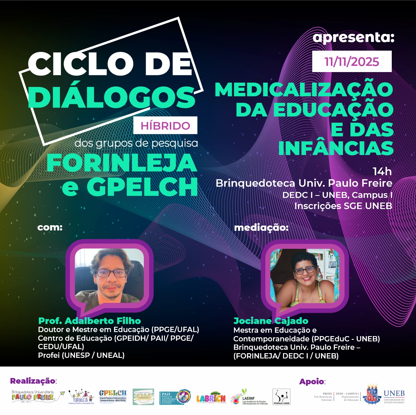 NUPE DEDC I Inscrição - 11/11/2025 à 11/11/2025CICLO DE DIÁLOGOS HÍBRIDO FORINLEJA - GPELCH DATA: 11/11/2025 HORÁRIO: 14h LOCAL: Brinquedoteca Universitária Paulo Freire –DEDC I/UNEB Visita e Bate-papo sobre Medicalização da educação e das infâncias Prof. Dr. Adalberto Duarte Pereira Filho - Doutor e mestre em Educação (UFAL)