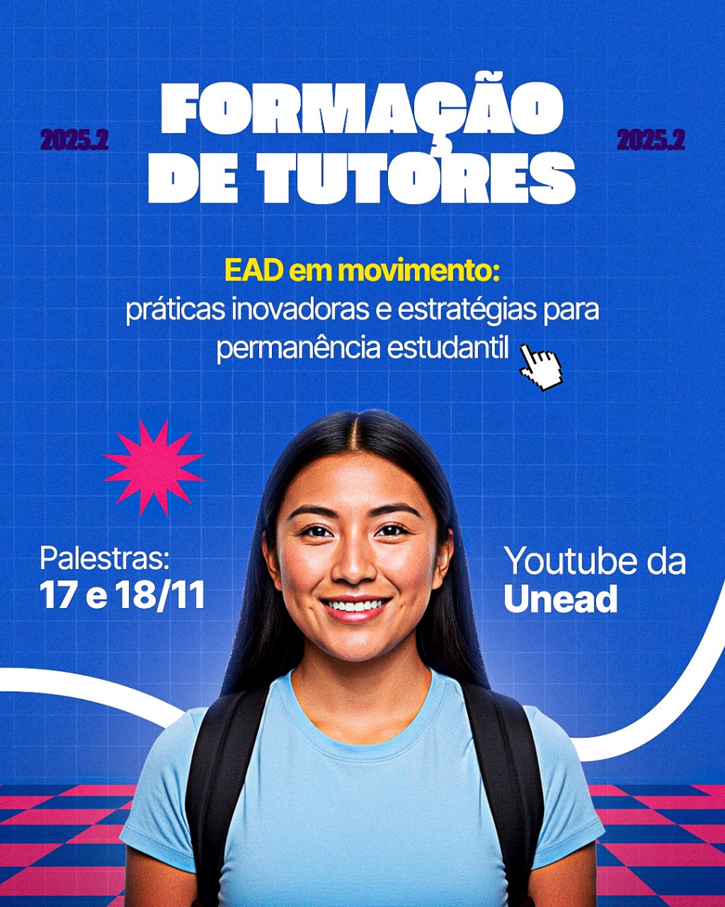 UNEAD Inscrição - 12/11/2025 à 18/11/2025A Formação de Tutores é um evento realizado pelos Núcleos de Design Educacional e de Tutoria da UNEAD, tem como objetivo promover formação inicial e continuada em tutoria, através de diversas atividades de interação com tutores UNEAD e comunidade externa. O curso é voltado para Tutores da UNEAD e para a comunidade externa. Sob o tema "EAD em movimento: práticas inovadoras e estratégias para permanência estudantil", esta edição do evento promove a discussão as potencialidades da IA Notebook LM e dialogar a respeito do acesso, da permanência e da evasão na EaD. A carga horária total será de 4 horas e os participantes inscritos poderão obter certificado de participação. Confira abaixo a programação do evento: Data/horário Temática/Palestrante Link de Acesso 17/11, às 19h Aprendizagem Inteligente: estudando com o Notebook LM, com o prof. Prof. Jeferson Pereira de Santana https://www.youtube.com/watch?v=dIXjIaK0tdQ 18/11, às 19h Acesso, permanência e redução da evasão na Educação a Distância: desafios e possibilidades, com o Prof. João Marciano de Souza Neto https://www.youtube.com/watch?v=ujd5tNFeY1M