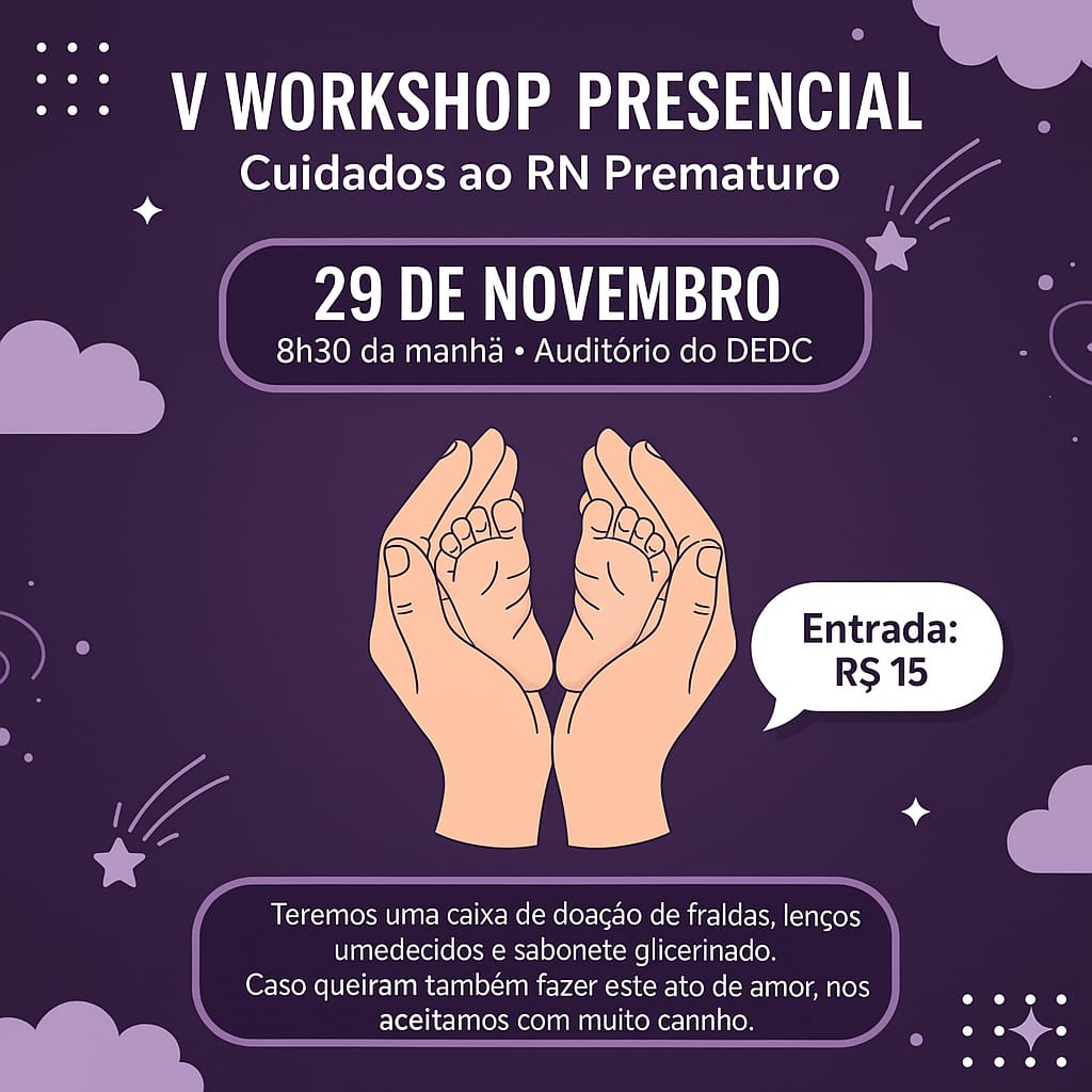 DCVI Inscrição - 12/11/2025 à 25/11/2025O Workshop com abordagem multiprofissional sobre os primeiros cuidados no recém-nascido pre-termo organizado pela Liga Acadêmica de Fisioterapia na Prematuridade (LAFP), tem como público alvo estudantes matriculados nos cursos da área da saúde (Enfermagem, Medicina, Fisioterapia, Fonoaudiologia, Terapia Ocupacional e Nutrição) interessados no tema.O evento tem como objetivo principal o ensino e a disseminação de técnicas baseadas em evidências científicas, abordando os principais fundamentos dos cuidados iniciais do prematuro. Workshop que ocorrerá de forma presencial no dia 29 de Novembro na Universidade do Estado da Bahia-UNEB oferecerá certificado de 4 horas, sendo uma excelente oportunidade para aprimorar habilidades e ampliar conhecimentos na área. Não perca essa chance de se atualizar e melhorar a sua prática profissional!