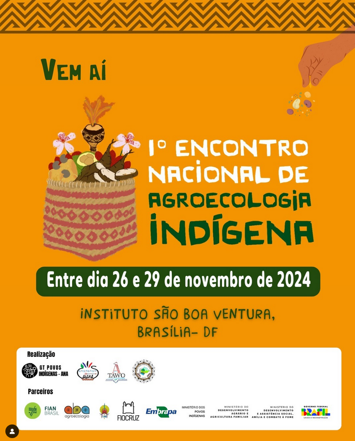 DEDC-XV Inscrição - 21/11/2024 à 27/11/2024O I Encontro Nacional de Agroecologia Indígena é protagonizado pelos povos indígenas integrantes do Grupo de Trabalho de Agroecologia Indígena da Articulação Nacional de Agroecologia (ANA), a organização ocorre em parceria com o Projeto de Extensão Vivências Costeiras/UNEB e com algumas instituições apoiadoras que estarão conosco neste encontro que é um marco estrutural na construção e no fortalecimento da Agroecologia, Sistemas Alimentares, Soberania e Segurança Alimentar e Nutricional dos povos Indígenas brasileiros. Este é um espaço para o diálogo, trocas de experiência e construção de estratégias entre os povos, sobre processos de gestão territorial, para proposição e acessibilidade de políticas públicas já instituídas sobre produção e desenvolvimento sustentável que fortalecem a PNGATI. Data: 26 a 29 de novembro de 2024 Local: Instituto São Boaventura – Brasília/DF "Territórios indígenas são imemorialmente agroecológicos".