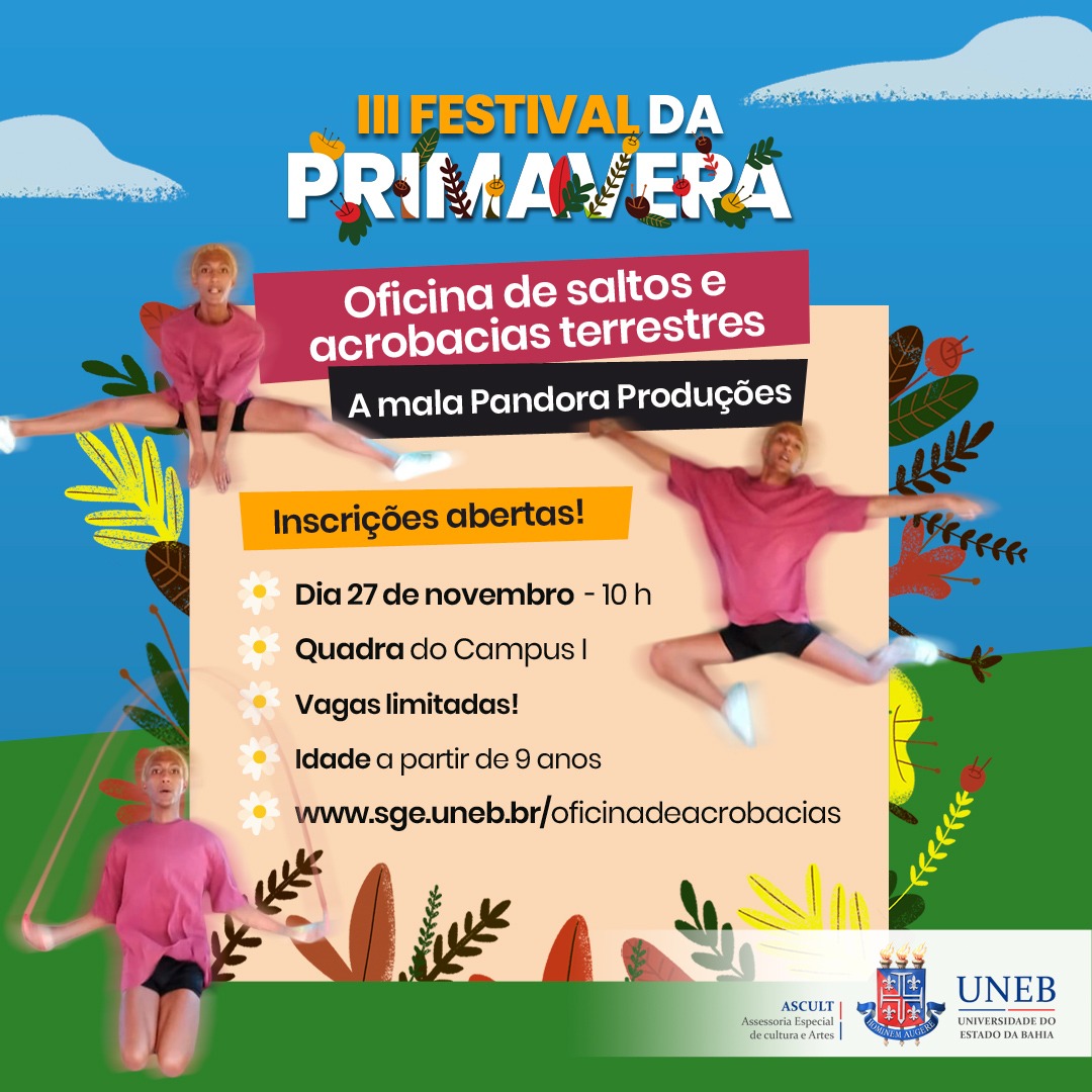 ASCULT Inscrição - 20/11/2024 à 26/11/2024III Festival da Primavera da UNEB Oficina de Acrobacias Terrestres e Saltos Ministrada por: A mala Pandora Produções Às 10h Quadra do campus I, ao lado do Teatro UNEB Vagas limitadas! A partir de 9 anos