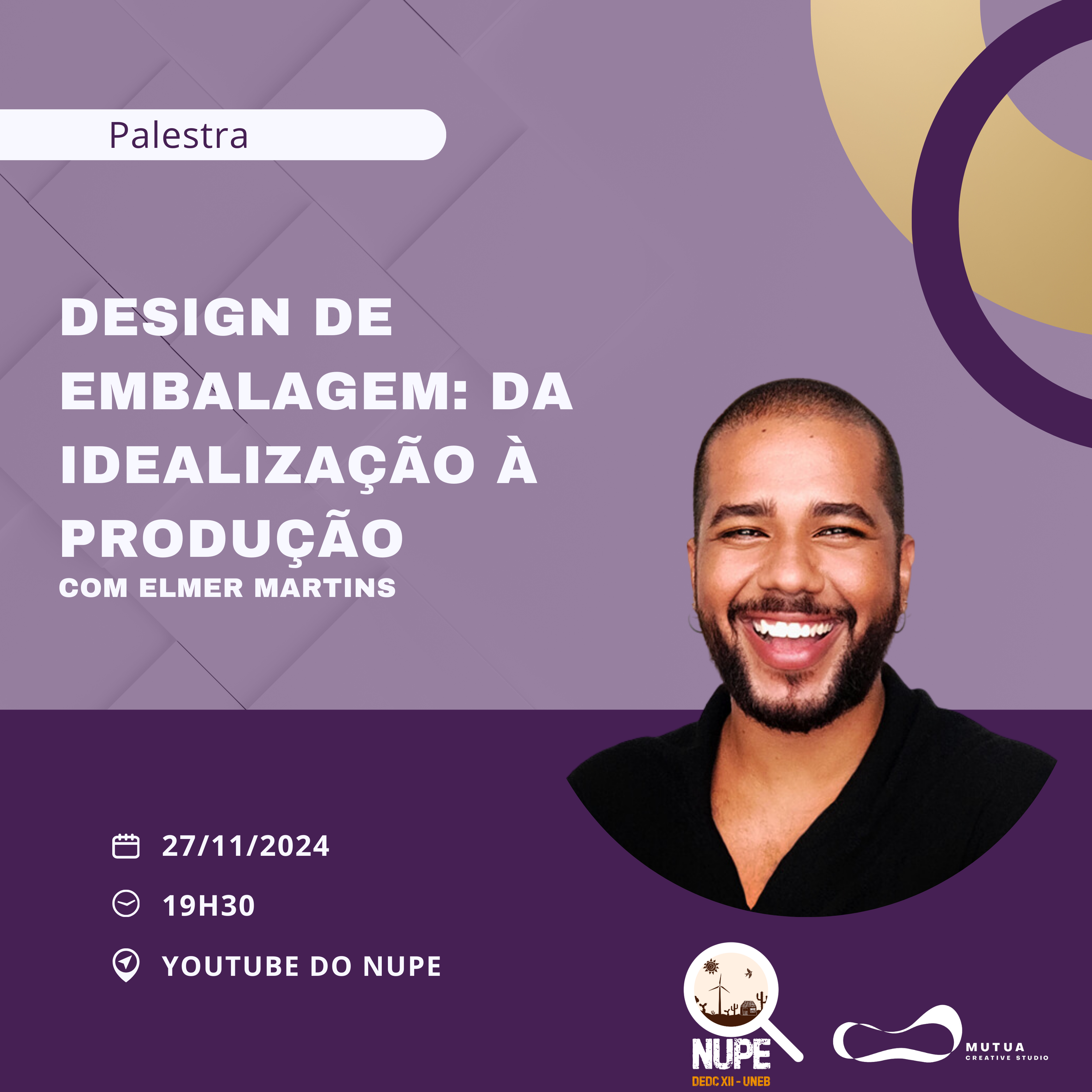 DEDCXII Inscrição - 21/11/2024 à 27/11/2024Com mais de nove anos de experiência atuando com Design Gráfico e Design de Embalagens, Elmer usa a interdisciplinaridade, o dinamismo e a paixão por contar histórias como ferramentas para a construção de uma mensagem de forma estratégica, crendo que é possível criar pontes, possibilitar diálogos e tocar vidas de forma orgânica e responsável através do design. Nascido no sudoeste baiano e residindo em Salvador, é Graduado em Design com Habilitação em Comunicação Visual e ênfase em Meios Digitais pela UNIFACS - Universidade Salvador e fundador do Mutua Creative Studio, estúdio de design que atua no seguimento. Em sua caminhada profissional já passou pelos áreas de marketing em entretenimento pela On Line Entretenimento, industrial pela Avatim - Cheiros da Terra e Hertz farmacêutica, dentre vários outros projetos desenvolvidos através do seu estúdio e em parceria com agências publicitarias e empresas do segmento comunicacional. Será uma palestra para alunos do curso de Administração e pessoas interessadas na temática. A palestra terá duração aproximada de 2h e acontecerá no Youtube do Nupe do Campus XII, no dia 27/11/2024, às 19:30 hs. Link: https://youtube.com/live/3kcLAQqoieg