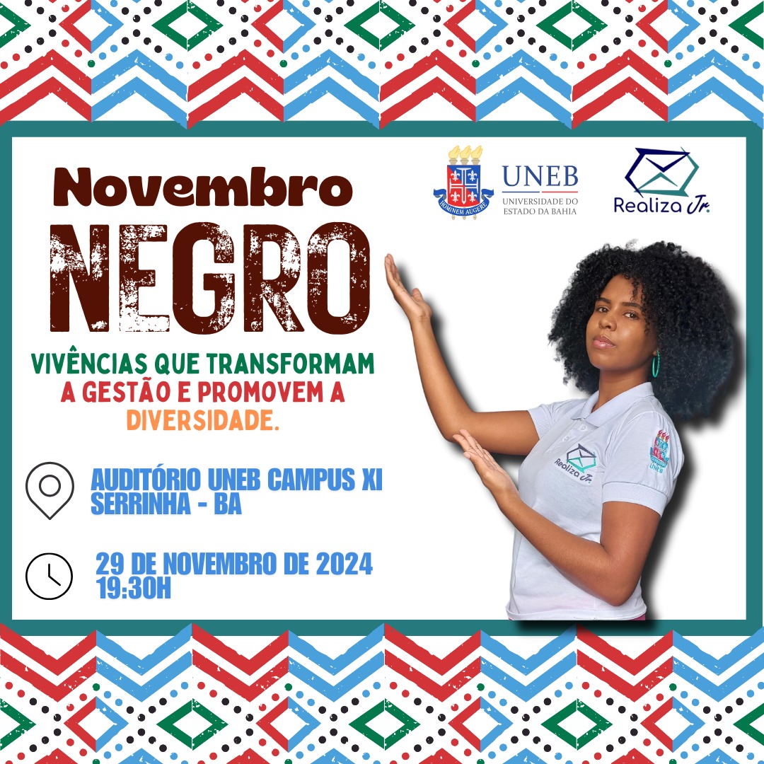 DEDCXI Inscrição - 22/11/2024 à 29/11/2024Tema: Novembro Negro. Vivências que transformam a gestão e promovem a diversidade. 1- Introdução: O Novembro Negro na Realiza Jr. pretende fomentar a discussão sobre uma temática ainda carente no curso de administração. Para tanto, propõe uma Roda de Conversa com profissionais da área de administração, visando debater sobre gestão e promoção da diversidade nas instituições. O foco será a importância histórica, social e cultural da luta contra o racismo e a valorização da cultura afro-brasileira como um elemento que deva ser estimulado nas empresas e demais ambientes relacionados às/aos profissionais que atuam no campo da gestão, reforçando a conscientização e o compromisso com a igualdade racial. 2. Objetivo Geral: Promover a conscientização sobre as desigualdades raciais, celebrar a herança cultural africana, e engajar profissionais da àrea de administração em uma reflexão profunda sobre a importância da inclusão e da equidade racial nos ambientes institucionais em que atuam.