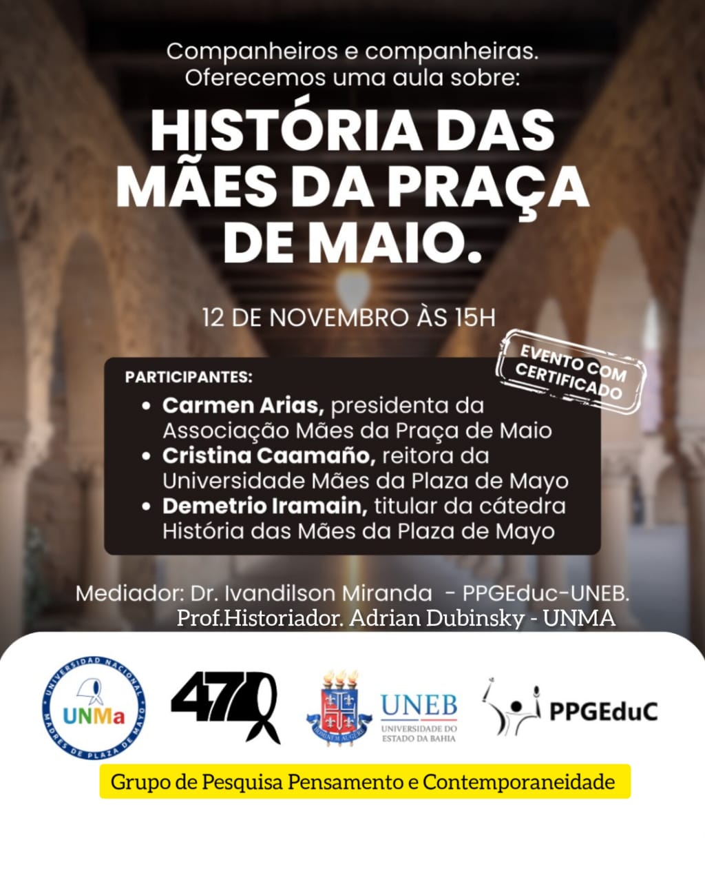 PPGEduC Inscrição - 11/11/2024 à 12/11/2024O Grupo de Pesquisa Pensamento e Contemporaneidade (PPGEDUC/UNEB), coordenado pelo Professor Doutor Luciano Santos, e a Universidade Nacional das Madres da Praça de Maio, convidam estudantes, professores, pesquisadores e todas as pessoas que se interessam em pensar uma outra América Latina para participar da Conferência sobre a História das Madres da Praça de Maio, que será realizada no dia 12/11 às 15:00hs, através do Google Meet. Teremos a participação de Carmen Arias (Presidenta da Associação das Madres da Praça de Maio), Cristina Caamaño (Reitora da Universidade das Madres da Praça de Maio-UNMA) e Demetrio Iramain (Titular da Cátedra de História das Madres da Praça de Maio- UNMA). A mediação será feita pelo Professor Doutor Ivandilson Miranda (Grupo de Pesquisa Pensamento e Contemporaneidade do PPGEDUC/ UNEB) e Adrian Dubinsky (Historiador UNMA). Participem, divulguem e façam parte dessa história que aproxima duas grandes Universidades Populares e dois países fundamentais para a nossa América Latina. Segue link da reunião remota. Clase Historia de Madres. Martes, 12 de nov • 3:00–5:00?p. m. Información para unirse a la reunión de Google Meet Vínculo a la videollamada: https://meet.google.com/nan-oued-vku O marca: PIN de +1 916-340-8448: 332 297 488#