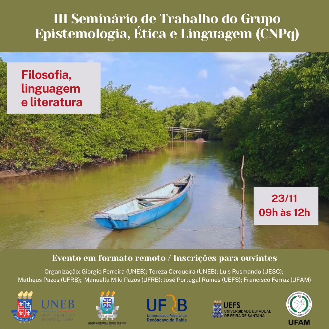 DCHTXXI Inscrição - 18/11/2024 à 21/11/2024O Seminário de Trabalho do grupo de Pesquisa "Epistemologia, Ética e Linguagem" tem por meta promover interação e interlocuções teóricas entre os membros do grupo, sobretudo em relação aos discentes de graduação. A proposta se dá por diversas razões. A primeira delas se deve ao fato dos membros do grupo pertencerem a instituições distintas (UNEB, UESC, UEFS, UFRB e UFAM) e estarem em cidades distantes umas das outras. Dessa maneira, o seminário é um meio de promover a interlocução entre os membros do grupo e de viabilizar o debate de seus trabalhos. A segunda razão para o seminário se dá com foco específico nos estudantes de graduação, pois, mediante os seminários, espera-se que eles iniciem no mundo da apresentação e debate de seus trabalhos, bem como iniciem as interlocuções com pesquisadores de outras instituições e de outras áreas. A terceira das razões, e que decorre das duas primeiras, é a consolidação de um locus e de uma rotina de trabalhos envolvendo os pesquisadores do grupo, sejam os mais experientes sejam os que estão iniciando. A segunda edição do evento é organizado pelos professores Dr. Giorgio Ferreira (UNEB), Ms. Tereza Cristina Cerqueira (UNEB), Dr. Matheus Pazos (UFRB) e Dra. Manuella Miki Pazos (UFRB). Inscrições para ouvintes de 19 a 21 de Novembro.