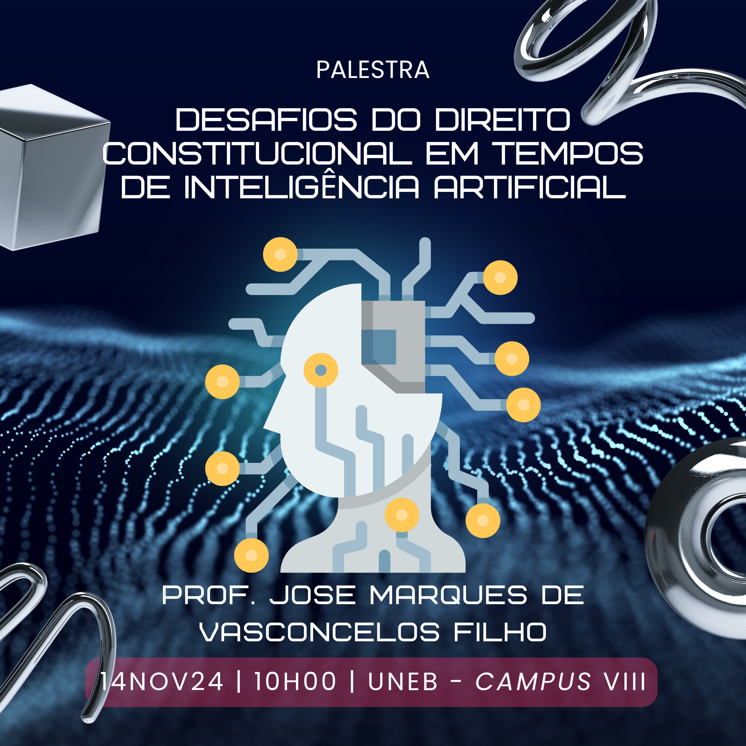 DEDCVIII Inscrição - 13/11/2024 à 14/11/2024O cenário jurídico está em constante transformação, e a inteligência artificial (IA) surge como um novo e poderoso fator de mudança. Em tempos de avanço tecnológico acelerado, é crucial refletirmos sobre os impactos e desafios que a IA impõe ao Direito Constitucional. Questões como proteção de direitos fundamentais, privacidade, igualdade e os limites do poder estatal precisam ser repensadas à luz dessa nova realidade. Convidamos você para uma palestra imperdível sobre o tema: "Desafios do Direito Constitucional em Tempos de Inteligência Artificial" ?? Data: 14.11.2024 ? Horário: 10h ?? Local: Sala de Videoconferência - Prédio Caminhos da Caatinga - UNEB - Campus VIII - Paulo Afonso ?? Palestrante: José Marques de Vasconcelos Filho é advogado. Mestrando em Direito pelo PPGD/CESMAC. Especialista em Direito Constitucional pelo Complexo Educacional Damásio de Jesus. Bacharel em Direito pela Faculade de Direito de Maceió (FADISMA/CESMAC). Vice-reitor da Faculdade São Vicente (FASVIPA), em Pão de Açúcar (AL). Direotr-Geral da ESA-AL (2022-2024). Co-organizador dos livros Direito, Sociedade e Violência: pobreza, educação e criminalidade e A rua e democracia. Professor de Direito Constitucional. Quem deve participar: estudantes de Direito, advogados, profissonais das áreas jurídica e tecnológica e ao público em geral. Certifcado de 4 h/a. Contamos com a sua presença!