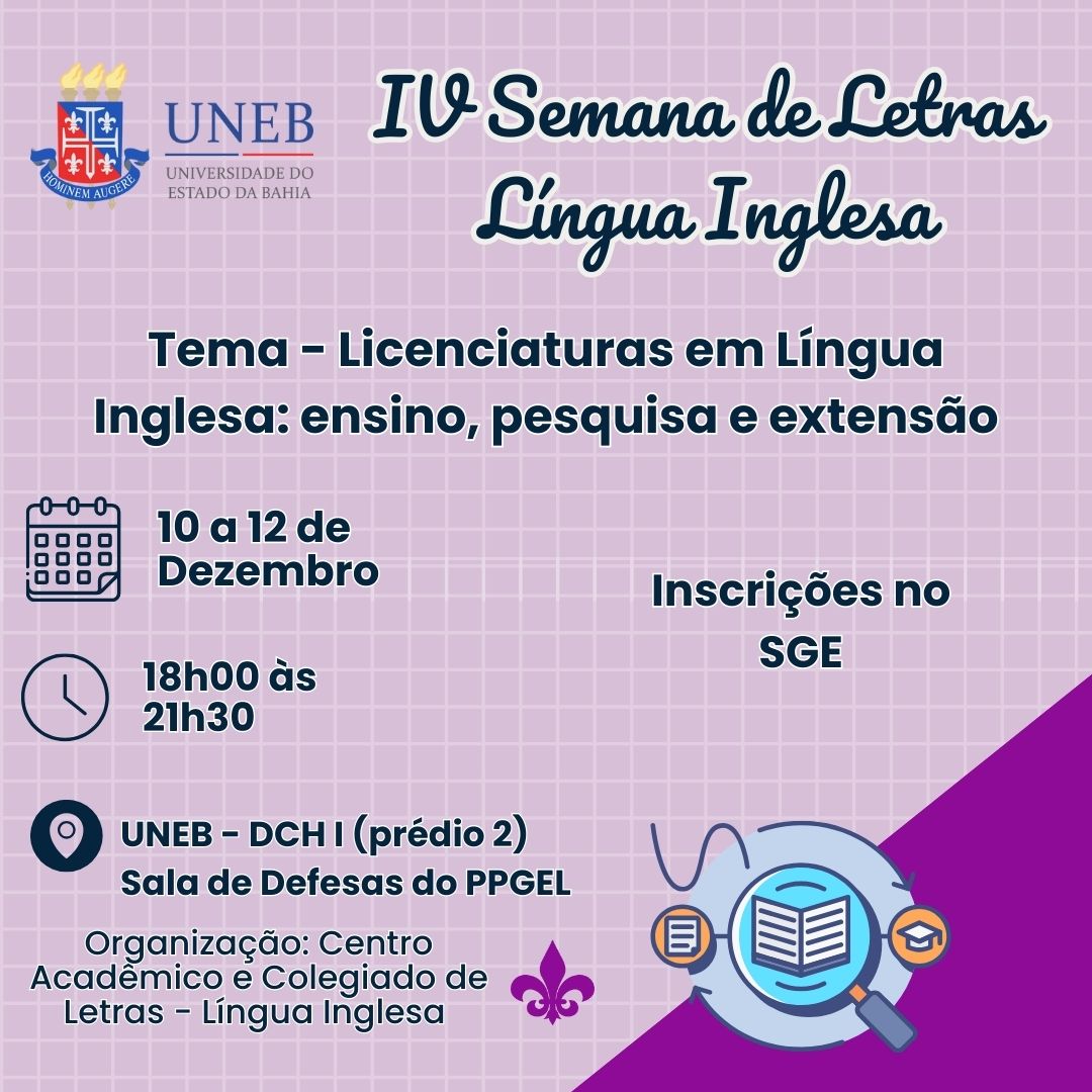 DCHI Inscrição - 19/11/2024 à 15/01/2025universidade do estado da bahia - uneb DEPARTAMENTO DE CIÊNCIAS HUMANAS - DCH I LETRAS LINGUA INGLESA E SUAS RESPECTIVAS LITERATURAS IV SEMANA DE LETRAS INGLÊS Licenciaturas de Língua Inglesa: ensino, pesquisa e extensão 10 de Dezembro (Local: Departamento de Ciências Humanas - Campus I - Sala de Defesa do PPGEL) 18:15 - 18:30 Solenidade de Abertura 18:30 - 19:10 Palestra de abertura Prof. Dr. Eliseu Clementino de Souza (PPG - Uneb) (Mediação: Profa. Dra. Daniela Mascarenhas) 19:10 - 19:30 Debate 19:30 - 19:45 Intervalo 19:45 - 21:00 Sessão de Comunicação Oral 1 (Mediação: Prof. Edvan Cardoso ) 11 de Dezembro (Local: Departamento de Ciências Humanas - Campus I - Sala de Defesa do PPGEL) 18:15 - 19:00 Palestra: Nas trilhas da pós-graduação: caminhos e desafios Prof. Dr. Nerivaldo Alves de Araújo (PPGEL - Uneb) (Mediação: Profa. Dra. Elisangela Santana dos Santos) 19:10 - 19:30 Debate 19:30 - 19:45 Intervalo 19:45 - 21:00 Sessão de Comunicação Oral 2 (Mediação: Profa. Dra. Isolda Lisboa ) 12 de Dezembro (Local: Departamento de Ciências Humanas - Campus I - Sala de Defesa do PPGEL) 18:15 - 20:00 Minicurso - BNCC de língua inglesa: implementação e desafios na escola pública Profa. Dra. Flávia Oliveira (UFBA) (Mediação: Prof. Me. Sanio Santos da SIlva) 20:00 - 21:30 Apresentação cultural pelos graduandos Letras Inglês DCH-I