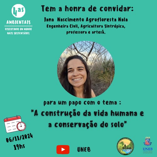 DEDCXI Inscrição - 29/10/2024 à 06/11/2024As Quartas Ambientais é um projeto de extensão do Curso de Especialização em Análise Ambiental e Gestão Sustentável do Território que têm como objetivo levar informação para toda a comunidade por meio de palestras, mesas redondas, seminários, entre outros. Convidando profissionais das diferentes áreas das ciências ambientais, representantes da sociedade civil organizada, ONGs, cientistas, gestores públicos e privados que tratem de temas ligados às questões ambientais e o desenvolvimento sustentável. Evento híbrido: presencialmente no Auditório prof. Dr. Roberto Sidney - UNEB - DEDC XI e transmissão pelo canal do YouTube UNEB DEDC XI - SERRINHA.