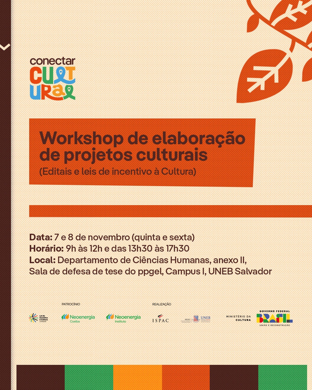 ASCULT Inscrição - 01/11/2024 à 07/11/2024Aprenda a elaborar projeto para editais e leis de incentivo à cultura. As aulas acontecerão dias 07 e 08 de novembro, das 09h às 12h e das 13:30 às 17:30. Aulas presenciais, no Departamento de Ciências Humanas, anexo II, Sala de defesa de tese do PPGEL (Campus I - Salvador).