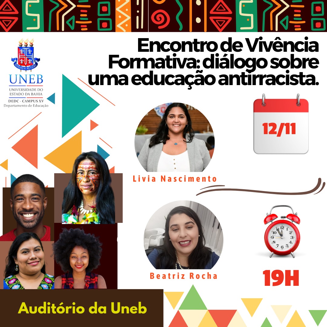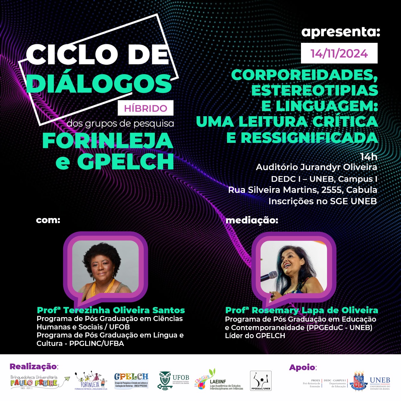 NUPE DEDC I Inscrição - 04/11/2024 à 14/11/2024Os Grupos de Pesquisa FORINLEJA e GPELCH -DEDC/PPGEduC/UNEB, em parceria com a Brinquedoteca Universitária Paulo Freire, a LAEIINF, a PROEX, PPGLINC/UFBA e UFOB realizam o CICLO DE DÍALOGOS HÍBRIDO. INFORME 14/11/2024: POR CONTA DA INSTABILIDADE DA ENERGIA ELÉTRICA NO DEDC I, A ATIVIDADE OCORRERÁ 100% ONLINE NO CANAL DO GRUPO DE PESQUISA - https://www.youtube.com/live/z8wNjVV5t04?si=AWLkYUcn0zGYH6s9 A IX Edição de 2024 ocorrerá dia 14/11/2024, às 14h, no Auditório Jurandyr Oliveira, prédio do Departamento de Educação - Campus I/UNEB, com a temática: Corporeidades, estereotipias e linguagem: uma leitura crítica e ressignificada. A transmissão será pelo Canal do YOUTUBE do FORMACCEINFÂNCIA UNEB. CERTIFICAÇÃO: 04 horas Maiores informações: Instagrans: formacceinfancia; brinquedotecapaulofreire; rosy.lapa Participem!