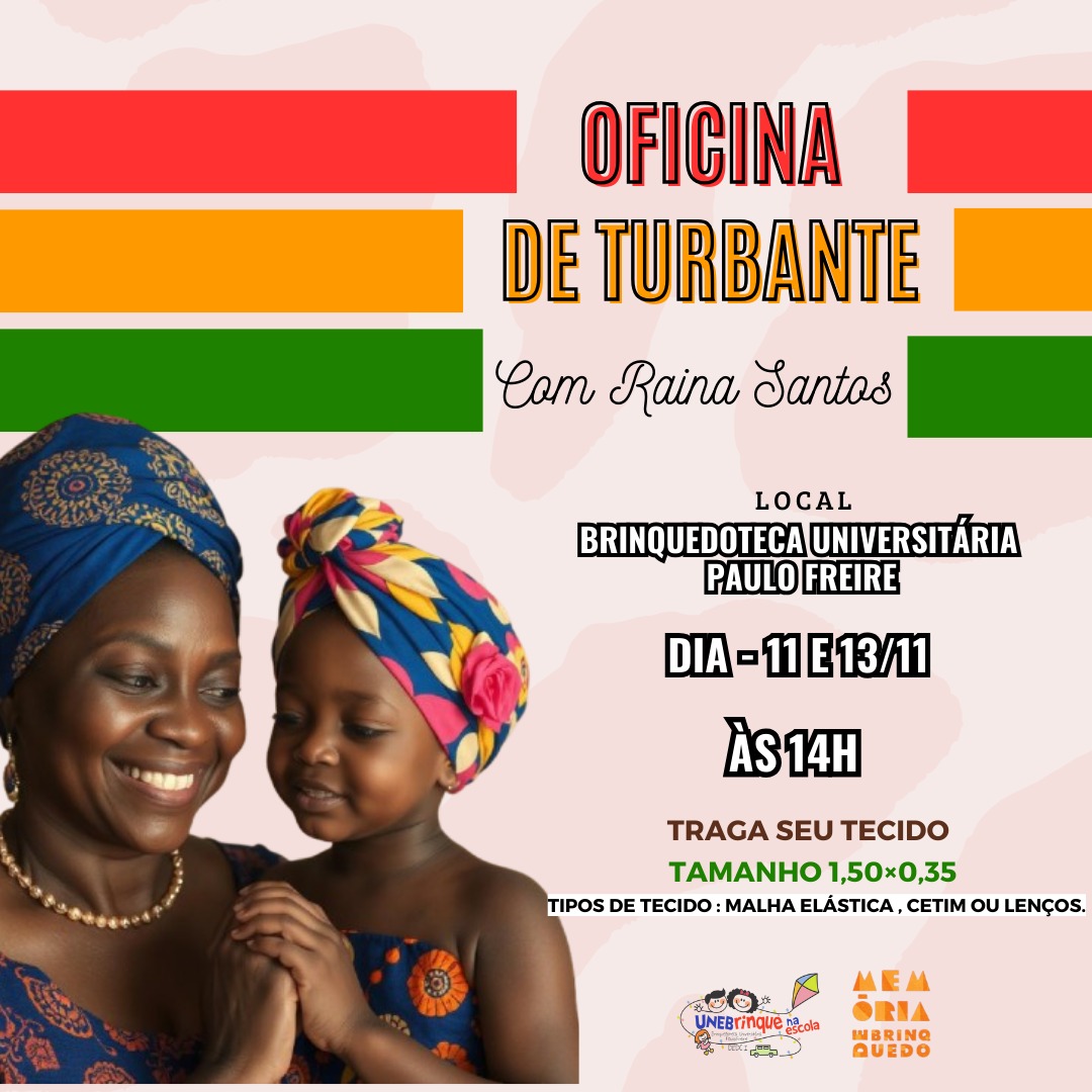 NUPE DEDC I Inscrição - 04/11/2024 à 14/11/2024Como parte integrante das ações do Projeto UNEBrinque na Escola e visando a multiplicação de facilitadores da técnica, a Brinquedoteca Universitária Paulo Freire - DEDC I/UNEB, em parceria com os Grupos de Pesquisa FORINLEJA e GPELCH e o Projeto Memórias de brinquedo, oferta a Oficina de turbante. Será ministrada pela nossa monitora e pesquisadora Raina Santos. DATAS: 11 e 13/11/2024 HORÁRIO: 14h LOCAL: Brinquedoteca Universitária Paulo Freire P.s.: TRAGA SEU TECIDO - tamanho 1,50 x 0,35 - malha elástica, cetim ou lenços. Maiores informações: brinquedotecadedc1@uneb.br/ WhatsApp: (71)99604-6166 COM CERTIFICAÇÃO
