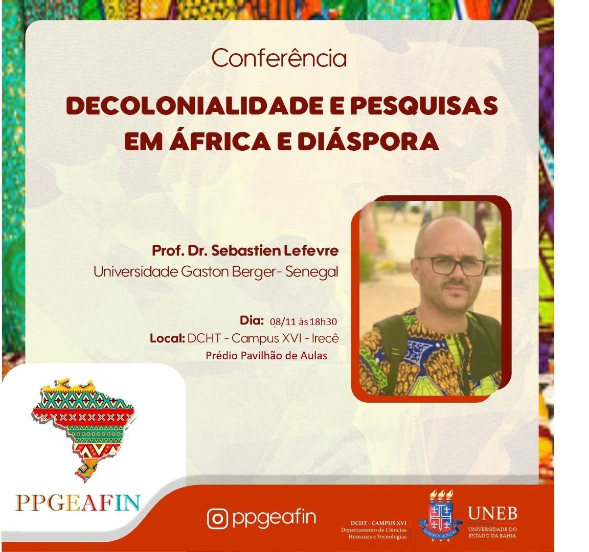 DCHTXVI Inscrição - 05/11/2024 à 08/11/2024CONFERÊNCIA - Decolonialidade e Pesquisas em África e Diáspora Palestrante : Profº Dr. Sebastien Lefevre da Universidade Gaston Berger - Senegal Local: Prédio Pavilhão de aulas Data:08/11/2024 Horário:18h30