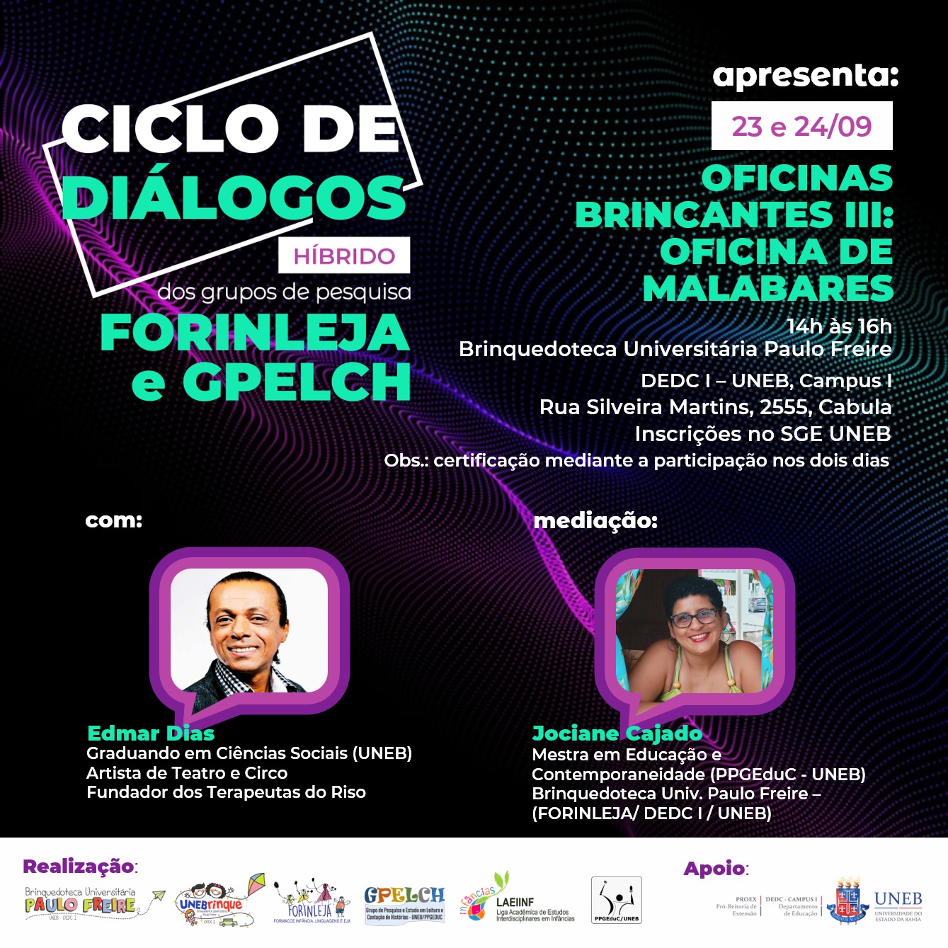 NUPE DEDC I Inscrição - 17/09/2024 à 24/09/2024Os Grupos de Pesquisa FORINLEJA e GPELCH -DEDC/PPGEduC/UNEB, em parceria com a Brinquedoteca Universitária Paulo Freire, a LAEIINF e a PROEX realizam o CICLO DE DÍALOGOS com OFICINAS BRINCANTES III. A VII Edição com a Oficina de Malabares, com Edmar Dias. LOCAL: Brinquedoteca DEDC I DATAS: 23 e 24/09/2024 HORÁRIO: 14h às 16h OBS: Certificação mediante a participação nos 02 (dois) dias. Maiores informações: Instagram:@formacceinfancia, @brinquedotecapaulofreire E-mail: brinquedotecadedc1@uneb.br Participem!