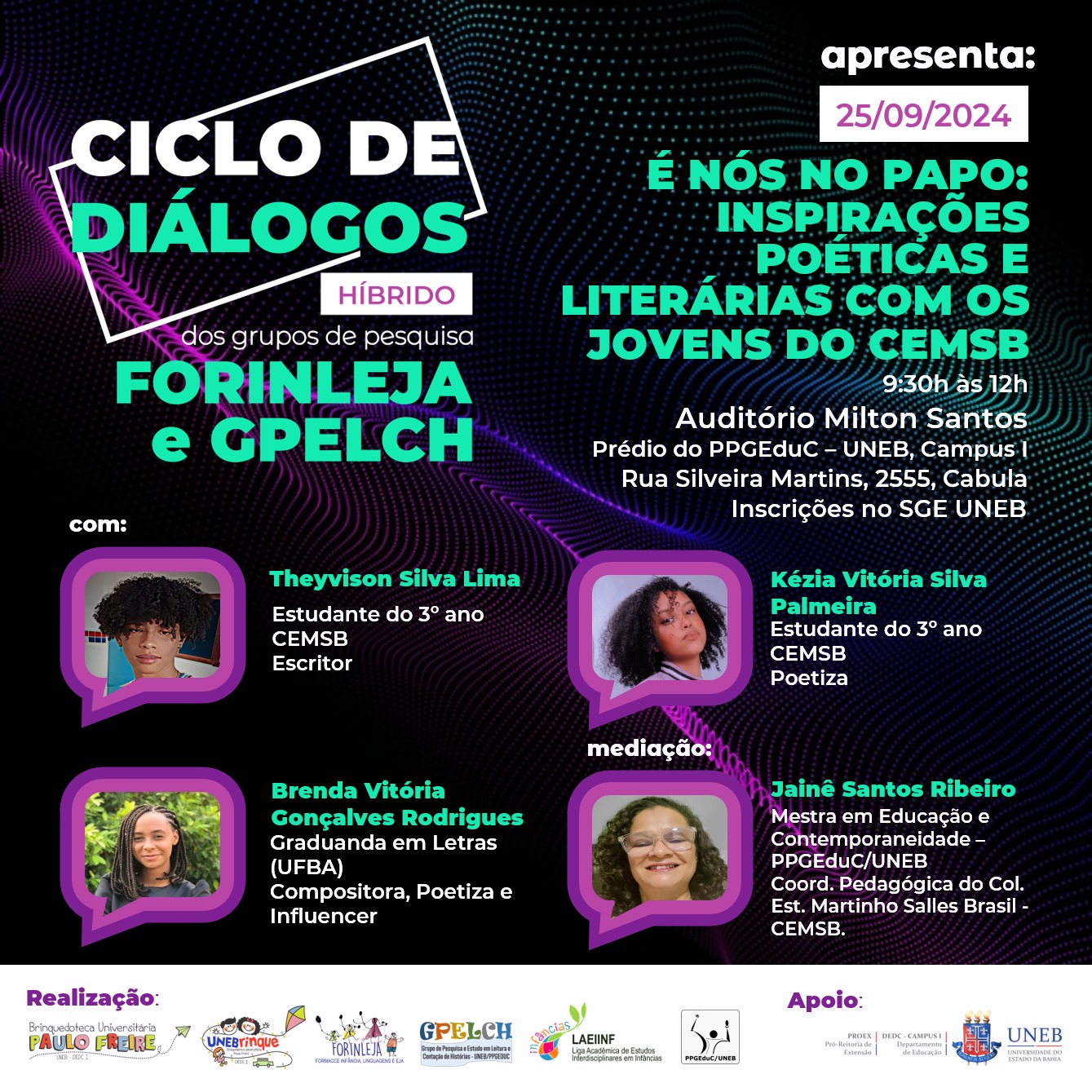 NUPE DEDC I Inscrição - 17/09/2024 à 25/09/2024Os Grupos de Pesquisa FORINLEJA e GPELCH -DEDC/PPGEduC/UNEB, em paceria com a Brinquedoteca Universitária Paulo Freire, a LAEIINF e a PROEX realizam o CICLO DE DÍALOGOS HÍBRIDO. A VIII Edição de 2024 ocorrerá dia 25/09/2024, às 10h, no Auditório Auditório Milton Santos do prédio da pós-graduação do Departamento de Educação - Campus I/UNEB, com a temática MESA V: É nós no papo: inspirações poéticas e Literárias com os jovens do CEMSB. A transmissão será pelo Canal do YOUTUBE do FORMACCEINFÂNCIA UNEB. Certificação de 04 horas. Maiores informações: Instagram:@formacceinfancia @brinquedotecapaulofreire E-mail: brinquedotecadedc1@uneb.br Participem!