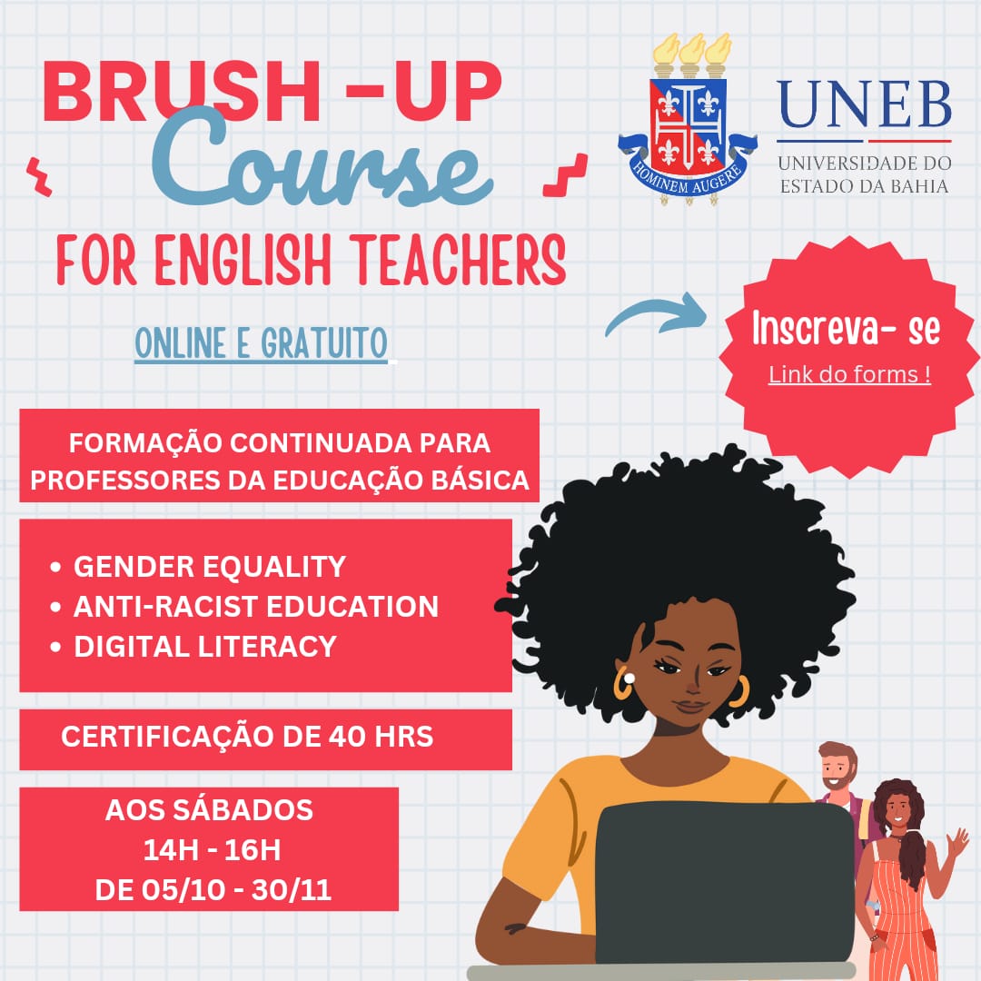 DCHI Inscrição - 23/09/2024 à 28/09/2024Brush-up course for English Teachers é uma proposta teórica-metodológica para praticarmos a língua inglesa ao mesmo tempo em que refletimos sobre o seu ensino/aprendizagem na Educação Básica. As Unidades Didáticas estão organizadas em eixos temáticos distintos a partir dos quais iremos praticar a compreensão e produção oral e escrita em língua inglesa de modo integrado. Os encontros síncronos estão divididos em dois momentos: o aprimoramento do uso da língua e em seguida a discussão das impressões dos participantes acerca da abordagem utilizada, tendo em vista seus aspectos teórico-metodológicos. Além disso, para as atividades assíncronas serão disponibilizados para a leitura artigos científicos e capítulos de livros com o intuito de ampliarmos as nossas reflexões acerca das abordagens de ensino, a partir da perspectiva da Linguística Aplicada Crítica. Carga horária: 40 horas (40% encontros síncronos e 60% atividades assíncronas) Período: 05/ outubro a 30/novembro (aos sábados: 05/10; 19/10; 26/10; 09/11; 23/11; 30/11) Horário: 14:00 - 16:30 Vagas Limitadas! Certificação: Mínimo de 75% de frequência obrigatória. Os certificados serão enviados por e-mail ao final do curso. Realização: Edital Proiex (Curso de Letras Língua Inglesa e respectivas Literarturas DCH -I) Prof. Dra. Daniela Mascarenhas Benedini Docentes: Isabela Raquira; Jadimile Souza; Geovane Brito