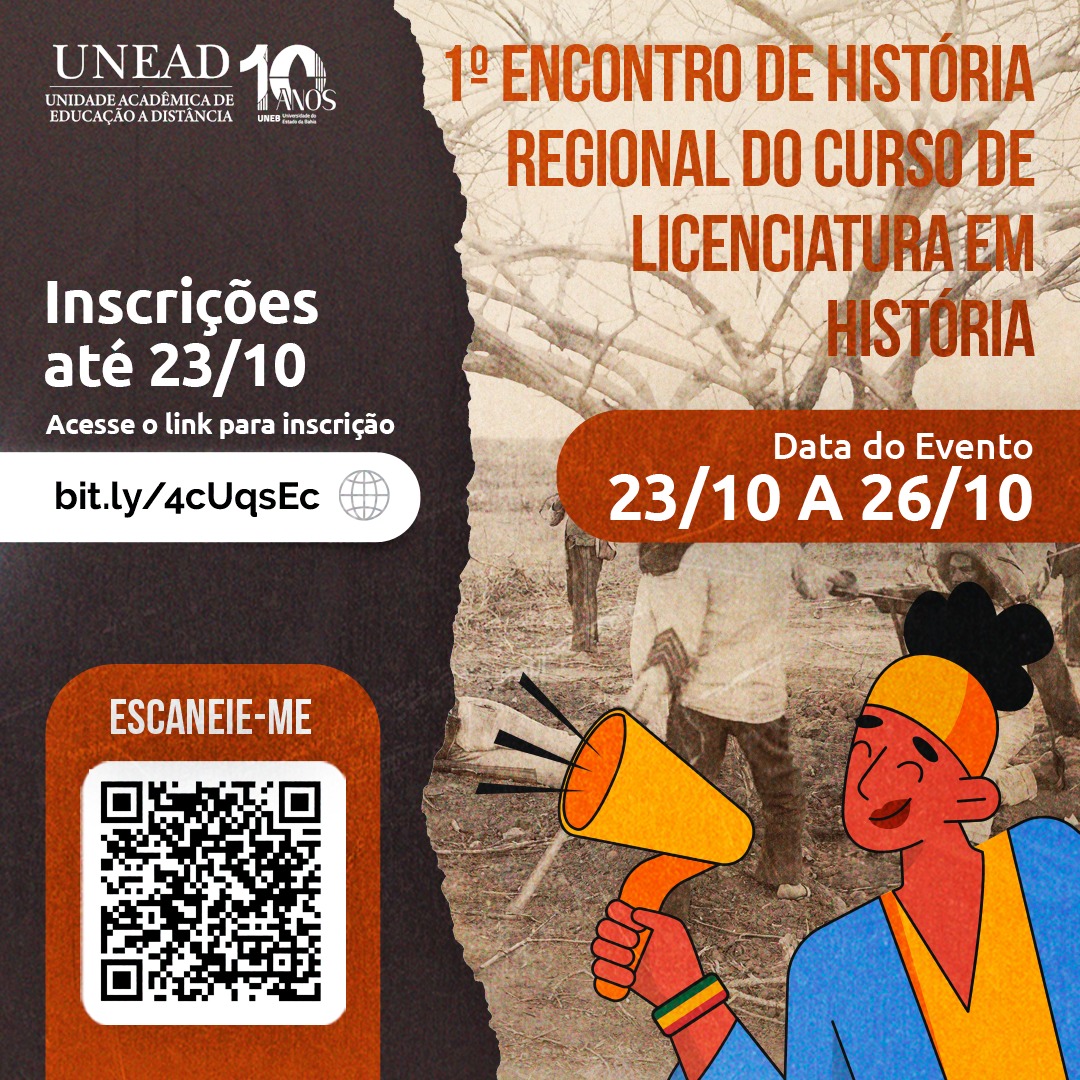 UNEAD Inscrição - 06/10/2024 à 23/10/2024SOBRE O EVENTO: O objetivo do 1º Encontro de História Regional do Curso de Licenciatura em História da UNEAD-UNEB é possibilitar a reflexão e o debate sobre história e a socialização das práticas de graduação na sociedade, no contexto da Festa Literária de Canudos (FLICAN). O evento acontece de 23 e a 26/10/2024 na cidade de Canudos. As inscrições serão realizadas até o primeiro dia do evento 23/10/2024, que se realizará de forma híbrida: online, no SGE da UNEB e, presencialmente, na FLICAN, em Canudos. O encontro é um desdobramento do Projeto de Extensão Encontro de História Regional e será realizado de forma hibrida e o(a)s inscrito(a)s poderão assistir as apresentações presencialmente, na FLICAN ou pelo Canal do YouTube “Sociedade em Rede: o Presente como História”, pelo link: https://www.youtube.com/@SociedadeemredeAlfredoMatta. Aberto a discentes da Licenciatura em História, a comunidade externa da UNEAD-UNEB e ao público da FLICAN, o encontro terá certificado de participação para o(a)s inscrito(a)s. Confira programação do evento: Data/Horário Tema Palestrante 23/10 Inscrições presenciais 24/10, às 09h Tema: Mesa Redonda sobre História Regional Prof. Dr. Saddo Ag Almouloud (UFPA) e Profa. Dra. Rita Lobo Freitas (UNEAD-UNEB) 25/10, das 09h às 20h Participação na FLICAN Inscritos no Projeto 26/10, das 09h às 20h Participação na FLICAN Inscritos no Projeto