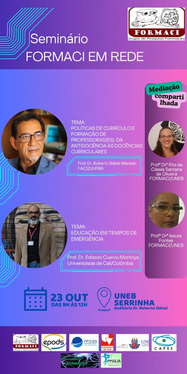 DEDCXI Inscrição - 11/10/2024 à 23/10/2024O Seminário FORMACI EM REDE será realizado no dia 23 de outubro de 2024, das 9h às 12 horas, no Auditório da UNEB, Campus XI - Serrinha. É um evento internacional que visa discutir políticas de currículo e formação de professoras/es na contemporaneidade e contará com duas conferências: a conferência do Prof. Dr. Roberto Sidnei Macedo, da FACED/UFBA, que tratará do tema “Políticas de Currículo e Formação de Professoras(es): Da antidocência às docências curriculares” e a conferência do Prof. Dr. Edisson Cuervo Montoya, da Universidade de Cali/Colômbia, cujo tema será “Educação em tempos de emergência”. O Seminário é uma iniciativa do Grupo de Pesquisa Formação, Currículo e (Inter) Subjetividades - Formaci/UNEB, em articulação colaborativa com a Rede de Pesquisa ObFormacce e parceria dos Programas de Pós-graduação MPIES/UNEB e MPEJA/UNEB. As inscrições estarão abertas até o dia 23 de outubro de 2024, através do SGE/UNEB e será disponibilizado certificado de participação para os/as participantes do evento.