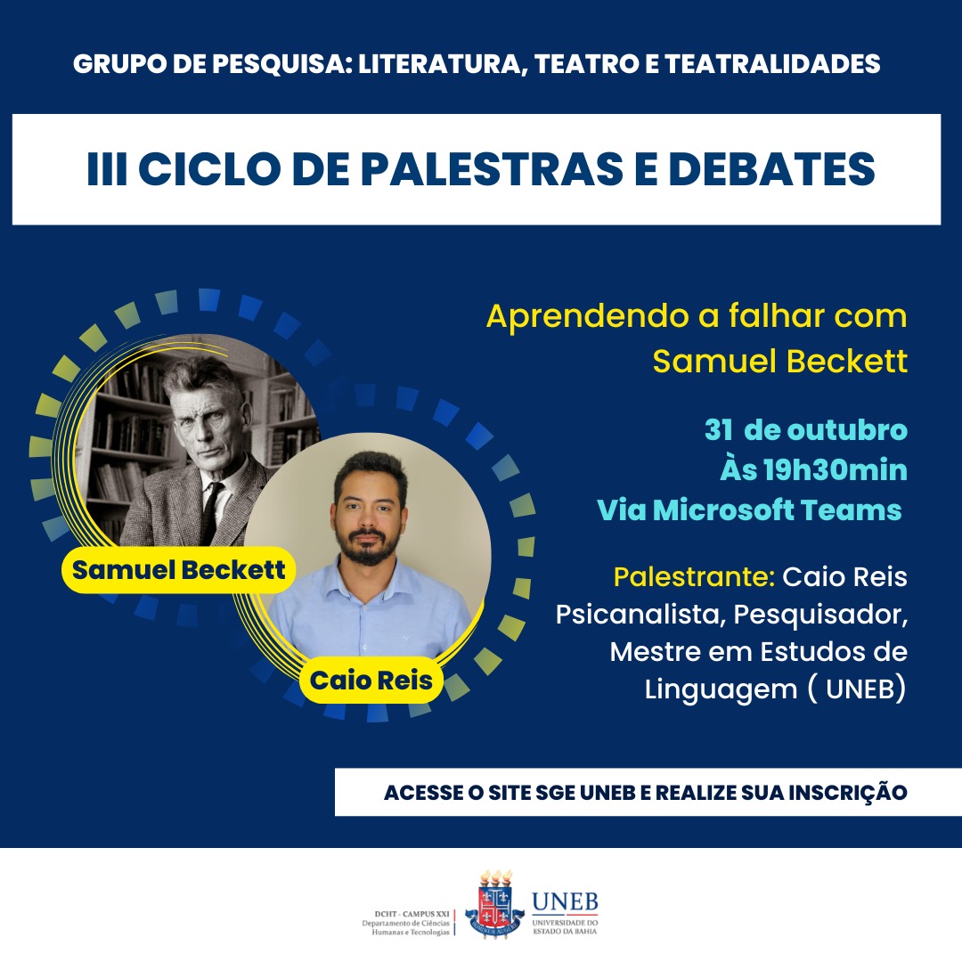 DCHTXXI Inscrição - 25/10/2024 à 31/10/2024O "III ciclo de palestras e debates" é uma ação do grupo de pesquisa "Literatura, Teatro e Teatralidades". A atividade contempla a proposta de estudo da literatura de Samuel Beckett, no Departamento de Ciências Humanas e Tecnologias, do Campus XXI, da UNEB. O objetivo deste ciclo é promover o debate e ampliar a discussão, no âmbito da UNEB, sobre a literatura do autor irlandês. O presente ciclo traz para a cena da discussão o convidado Caio Reis, psicanalista, Mestre em Estudos da Linguagem, pela Universidade do Estado da Bahia. O pesquisador é interessado em estudo da linguagem e pelo sofrimento humano. A palestra "Aprendendo a falhar com Samuel Beckett" , de Caio Reis, é um momento singular para discussões sobre aspectos da linguagem, a partir da produção literária de Samuel Beckett. O evento será realizado de forma remota, pela Plataforma Teams, às 19 h e 30 min, do dia 31 do mês de outubro, do ano em curso. INSCRIÇÕES ABERTAS DE 25/10 A 31/10. ATENÇÃO: INSCRIÇÕES PRORROGADAS ATÉ ÀS 14 H. ACESSE: SGE UNEB E CLIQUE NO EVENTO PARA INSCRIÇÃO.