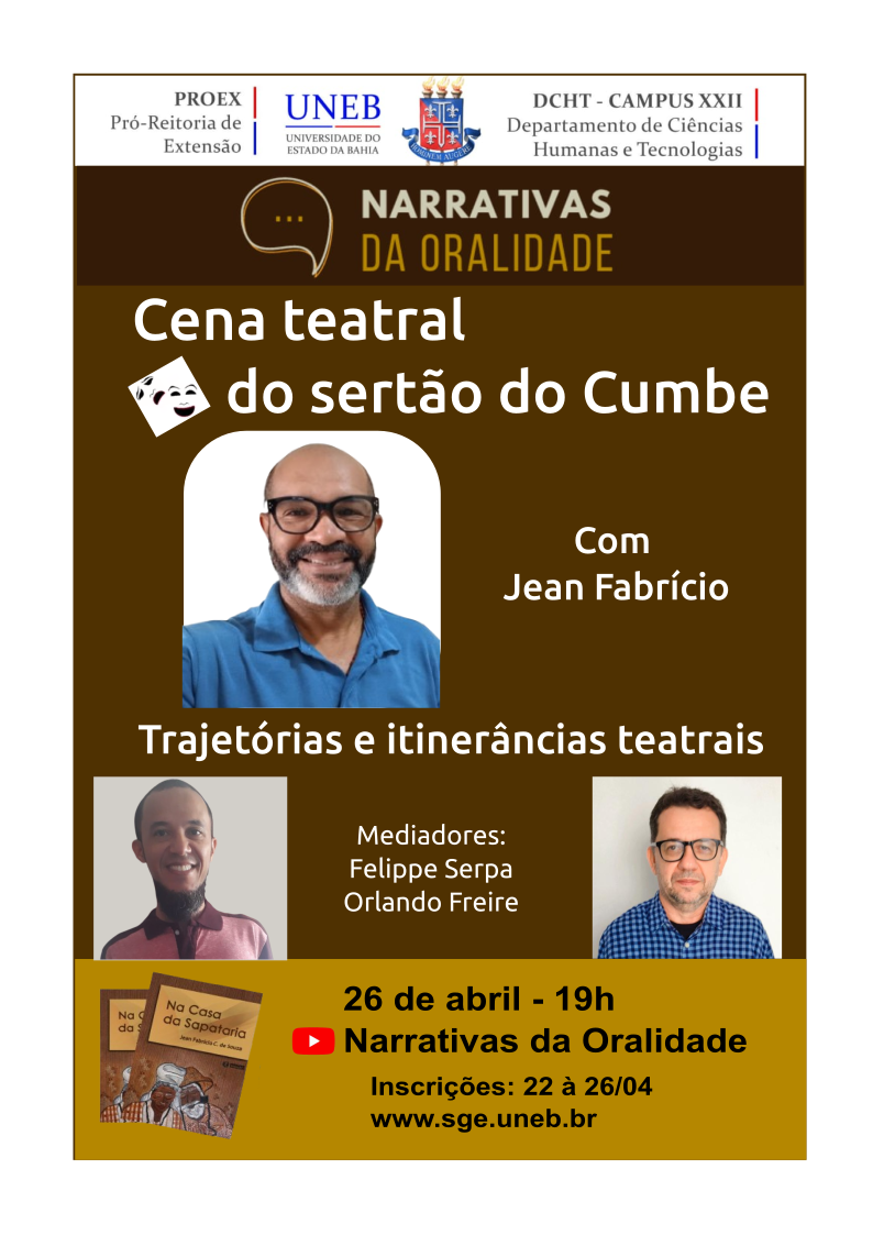 DCHTXXII Inscrição - 22/04/2024 à 26/04/2024Live intitulada "Cena teatral do sertão do Cumbe", com Jean Fabrício, poeta e diretor da "Farrapos Cia. de Teatro".