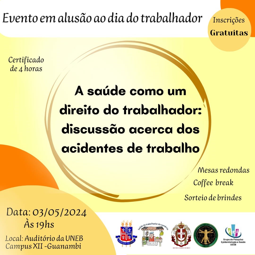 DEDCXII Inscrição - 23/04/2024 à 03/05/2024O Simpósio Interdisciplinar em Saúde e Direito do Trabalhador: discussão acerca dos acidentes de trabalho será realizado no dia 03 de maio, a partir das 19h no auditório da Universidade do Estado da Bahia (UNEB), DEDC, Campus XII na cidade de Guanambi – Bahia com objetivo principal de levantar reflexões sobre os direitos trabalhistas, acidentes de trabalho e a assistência de Enfermagem ao trabalhador acidentado, articulando assim os cursos de Direito e Enfermagem, além de parcerias institucionais com a Vigilância em Saúde do Trabalhador (VISAT) e o Serviço Móvel de Atendimento de Urgência (SAMU). A programação contará com uma mesa composta por profissionais que irão trazer amplas perspectivas do campo da saúde do trabalhador, compartilhando seus conhecimentos e experiências para enriquecer a discussão. O simpósio surge como uma oportunidade ímpar de diálogo entre o curso de Direito e Enfermagem que embora cursos distintos, convergem na defesa dos direitos à saúde dos(as) trabalhadores(as) como assegurado pelo Sistema Único de Saúde (SUS). Desse modo, contamos com a participação e colaboração da comunidade acadêmica e externa para tornar o evento um importante espaço de aperfeiçoamento científico. Programação Atividade do Evento Início Palestrante Abertura do evento 03/05/2024 19:00 Mesa institucional Mesa redonda - Assistência de saúde ao trabalhador acidentado: atendimento e notificação 03/05/2024 19:30 Iuri Vilella Gomes A confirmar Mesa redonda – Direitos relacionados ao trabalhador acidentado 03/05/2024 20:30 A confirmar A confirmar Número de vagas: 200