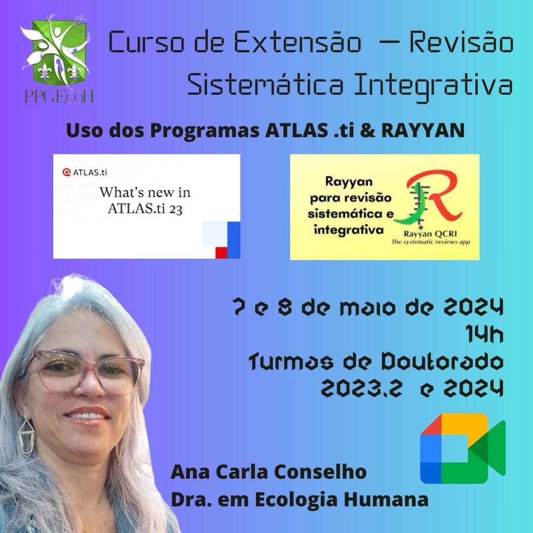 DTCSIII Inscrição - 01/05/2024 à 07/05/2024Curso de Extensão em Revisão Sistemática Integrativa para discentes de Doutorado em Ecologia Humana e Gestão Socioambiental com o uso de tecnologias - Softwares Atlas Ti e Ryyan.