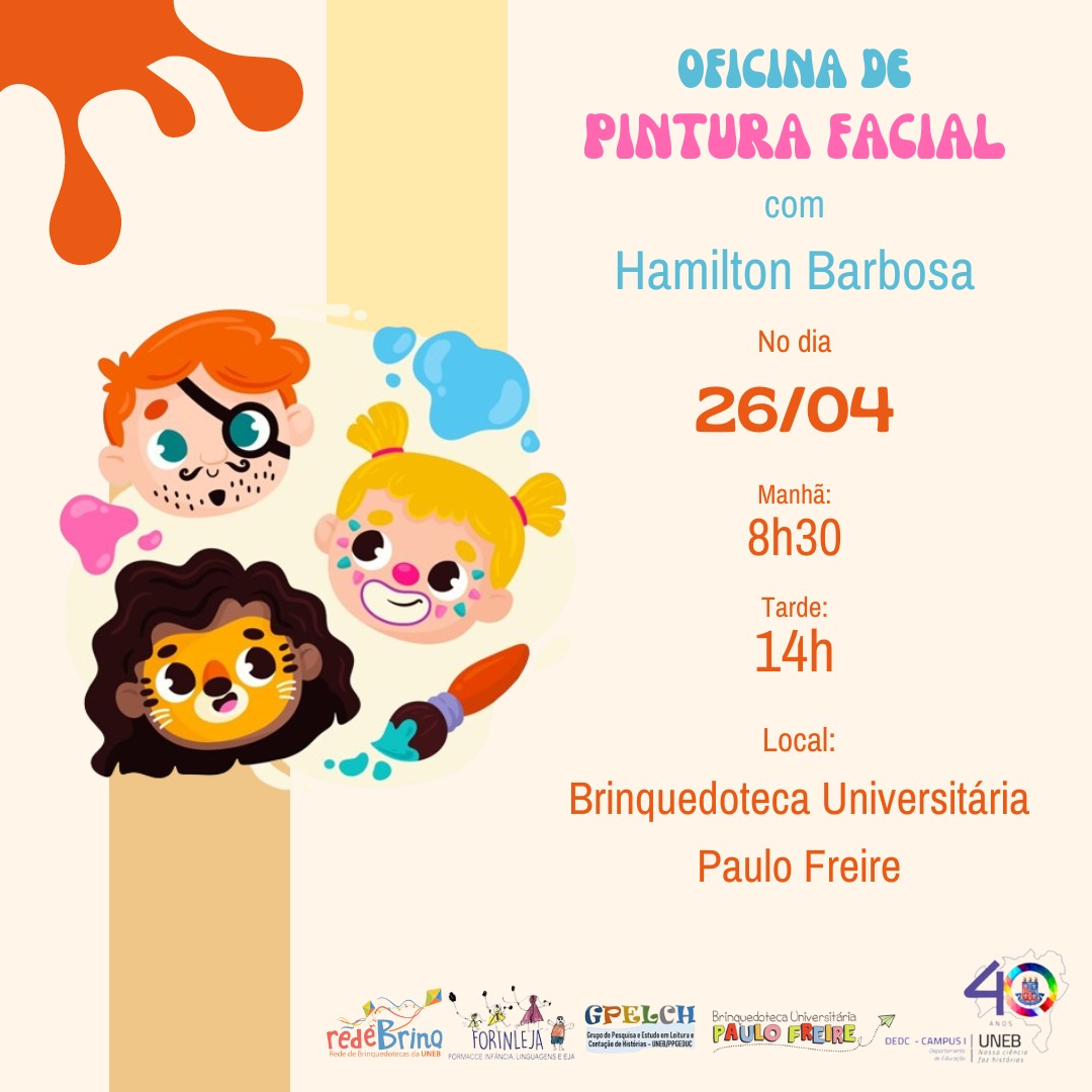 NUPE DEDC I Inscrição - 24/04/2024 à 26/04/2024Olá! Com alegria, a Brinquedoteca Universitária Paulo Freire inicia sua oferta de oficinas lúdicas em 2024, com a Pintura Facial, ministrada pelo nosso estimado colaborador Hamilton dos Santos Barbosa. DATA: 26/04/2024 HORÁRIO: Turma 1: das 8:30 às 11:30 Turma 2: das 14h às 16h LOCAL: Brinquedoteca Universitária Paulo Freire COM CERTIFICAÇÃO Participem e vamos fazer muitas crianças, jovens e adultos felizes!