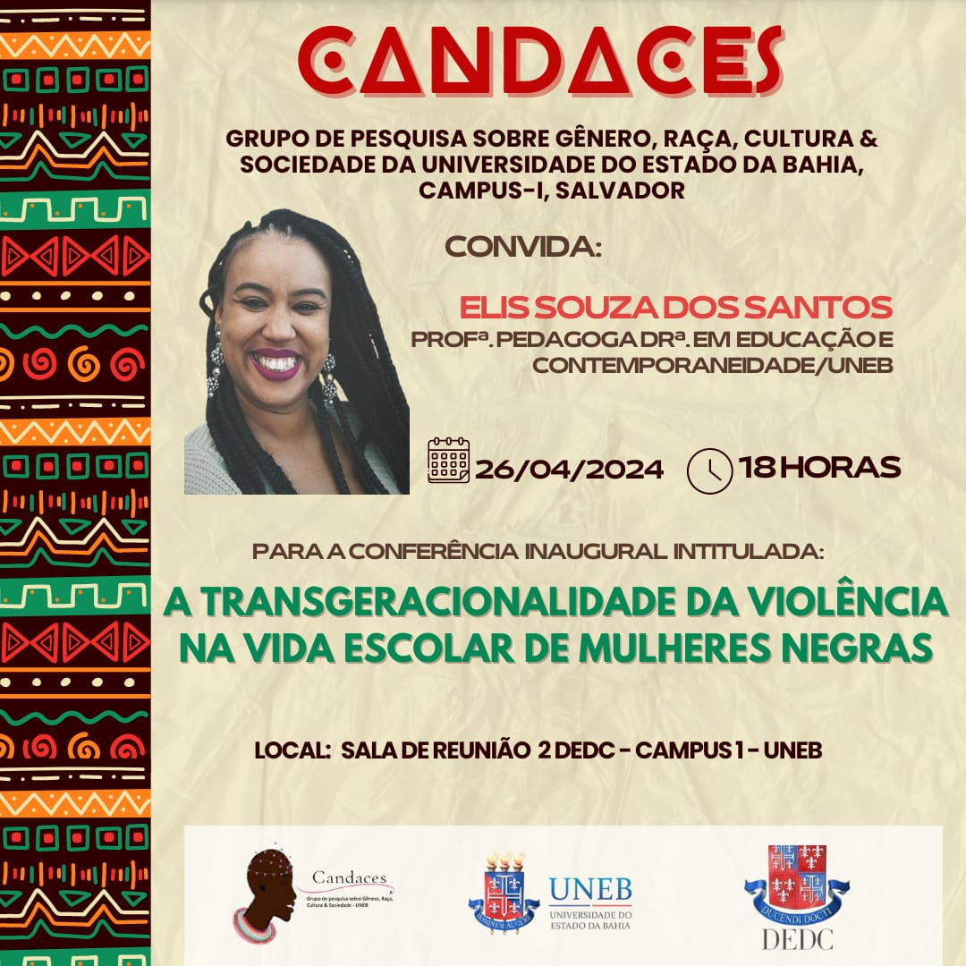 NUPE DEDC I Inscrição - 24/04/2024 à 28/04/2024O CANDACES/UNEB/DEDC I - Salvador, tem a satisfação de realizar o Ciclo de Estudos CANDACES de 2024.1. Para celebrarmos o início deste ciclo, temos a honra de receber a pesquisadora Pedagoga Dra. em Educação e Contemporaneidade - UNEB Elis Souza dos Santos, autora da tese – “Somos Marias de resistência: Um estudo interseccional sobre os itinerários de escolarização de mulheres negras mães”, para a conferência inaugural a ser realizada no dia e horário indicado acima. Na oportunidade convidamos a comunidade acadêmica dos diferentes departamentos e setores deste campus, assim como o público em geral para uma reflexão sobre a “Transgeracionalidade da violência” que historicamente atinge a vida das mulheres negras em nosso país. O Ciclo de formação Violência de Gênero e Raça e suas Interseccionalidades contará com a coordenação da Profa. Dra. Gizelda Alves – Candaces/ UNEB e da Profa. Dra. Joana Leôncio –Candaces/ UNEB. Venham prestigiar! Local: Sala de Reunião 2 –DEDC, Campus I, Salvador Data: 26/04/2024 (Sexta-feira); Horário: 18h às 20h