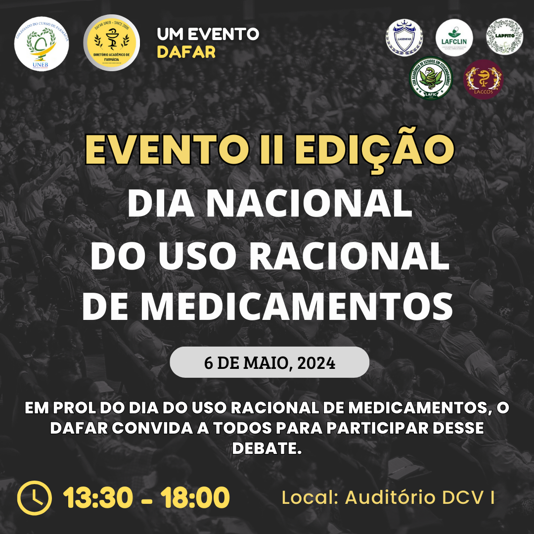 DCVI Inscrição - 25/04/2024 à 06/06/2024Evento Especial: Dia Nacional do Uso Racional de Medicamentos Junte-se a nós no dia 6 de maio de 2024 para um evento especial em comemoração ao Dia Nacional do Uso Racional de Medicamentos, que acontece no dia 5 de maio! Organizado pelo Diretório Acadêmico de Farmácia em colaboração com o Colegiado do Curso de Farmácia da UNEB, vamos promover uma discussão informativa e educativa sobre a importância do uso consciente de medicamentos. Prepare-se para uma programação com debates interessantes e atividades interativas. Juntos, podemos aprender sobre como usar medicamentos de maneira segura e eficaz para proteger a nossa saúde e o meio ambiente. - Dia: 06 de maio de 2024 - Horário: das 13:30 às 18:00h - Local: Auditório do DCV I Participe desse evento e ajude a promover uma cultura de uso racional de medicamentos! Esperamos vê-lo lá!