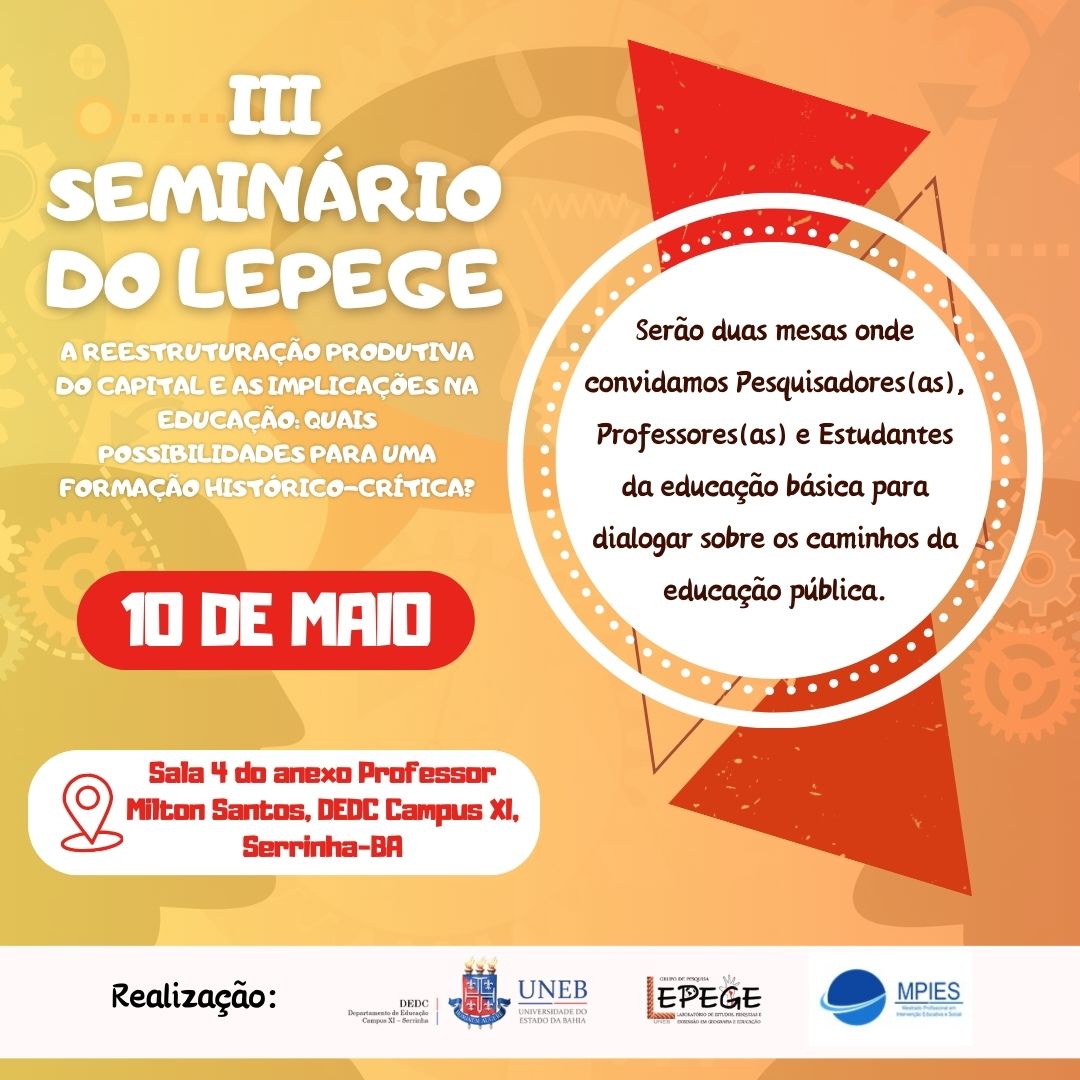 DEDCXI Inscrição - 29/04/2024 à 10/05/2024O grupo de pesquisa LEPEGE da Universidade do Estado da Bahia convida toda a comunidade acadêmica e comunidade externa para participar do seu III Seminário, que terá como título “A REESTRUTURAÇÃO PRODUTIVA DO CAPITAL E AS IMPLICAÇÕES NA EDUCAÇÃO: QUAIS POSSIBILIDADES PARA UMA FORMAÇÃO HISTÓRICO-CRÍTICA?”. O LEPEGE: grupo de pesquisa vinculado à linha 2 do Mestrado Profissional em Intervenção Educativa e social do Departamento de Educação da UNEB Campus XI, em suas linhas de pesquisa tem como perspectiva convergir atividades de ensino, pesquisa e extensão referentes à análise da relação sociedade e natureza em suas interfaces com a Educação e a Geografia considerando suas repercussões socioespaciais. Também visa produzir compreensões acerca dos projetos de sociedade em disputa considerando suas correlações no âmbito dos paradigmas científicos, no arranjo socioespacial, nas teorias e práticas educacionais, bem como nas concepções de homem e de sociedade. Este seminário é espaço de socializar as ações e intenções das pesquisas do LEPEGE. Este seminário também é uma aula inicial do curso de extensão tem como finalidade principal contribuir com a formação dos/as pesquisadores/as vinculados/as ao Laboratório de Estudos Pesquisa e Extensão em Geografia e Educação (LEPEGE) nos princípios do Materialismo Histórico-dialético (MHD). O curso será espaço de leitura, análise e discussão de textos que contribuam para esclarecer a relação sociedade-natureza a partir do MHD, tendo em vista a formação docente histórico-crítica. Ao término do curso cada um dos/as pesquisadores escreverá um artigo vinculado a uma das linhas do LEPEGE para compor um e-book que terá o mesmo título do curso. Objetivo Geral: Realizar a sistematização dos projetos de extensão e de pesquisa realizados pelo Laboratório de Estudos Pesquisa e Extensão em Geografia e Educação (LEPEGE) no período23/24 e iniciar os projetos de extensão 2024/25. Objetivos Específicos: Problematizar a relação entre a reestruturação produtiva do capital, as reformas educacionais e as implicações na educação, tendo em vista apontar possibilidades para uma formação histórico-crítica; Realizar a sistematização dos projetos de extensão e de pesquisa realizados pelo Laboratório de Estudos Pesquisa e Extensão em Geografia e Educação (LEPEGE) no período23/24; Promover a aula inicial do curso de extensão "Ciclo Formativo do LEPEGE – MHD e formação docente: desafios para uma prática pedagógica histórico-crítica". O seminário será realizado no dia 10/05 em dois turnos, matutino e vespertino. No matutino teremos a palestra A REESTRUTURAÇÃO PRODUTIVA DO CAPITAL E AS IMPLICAÇÕES NA EDUCAÇÃO que será proferida pelo professor Dr. José Arlen Beltrão da Universidade Federal da Bahia. No vespertino teremos a mesa AS IMPLICAÇÕES DA REESTRUTURAÇÃO PRODUTIVA DO CAPITAL NA EDUCAÇÃO BÁSICA: O NOVO ENSINO MÉDIO E OS ESVAZIAMENTO DA FUNÇÃO SOCIAL DA ESCOLA proferida por duas professoras da educação básica e dois estudantes do ensino médio. O evento acontecerá no dia 10/05/24 e terá a seguinte programação: 8:00 - Credenciamento 8:30 - Abertura 8:40 às 12: 00 - Mesa 1: REESTRUTURAÇÃO PRODUTIVA DO CAPITAL E AS IMPLICAÇÕES NA EDUCAÇÃO Provocação: Profa. Ma. Gelcivânia Mota Silva (SEC/BA, UNEB e Conselho Estadual de Educação) Palestrante: Prof. Dr. José Arlen Beltrão de Matos (CFP/UFRB) 14:00 – 17:00 – Mesa 2: NOVO ENSINO MÉDIO E OS ESVAZIAMENTO DA FUNÇÃO SOCIAL DA ESCOLA Provocação: Prof. Dra. Marize Damiana Moura Batista e Batista (SEC/BA e UNEB) Palestrantes: Profa. Ma. Juliana Araújo Santos (SEC/BA – Colégio Estadual de Biritinga); Professor Adriano Abreu (SEC/BA – Colégio Normal de Serrinha); Estudante de Ensino Médio Kennedi Cerqueira de Souza (SEC/BA – Colégio Rubem Nogueira) Estudante Maria Eduarda da Silva (SEC/BA – Colégio Normal de Serrinha) Estudante Maria Ilone Santos (SEC/BA – Colégio Normal de Serrinha) Mediação: Acadêmico Anderson Dantas (estudante de Geografia UNEB XI) 17:00 - Encerramento