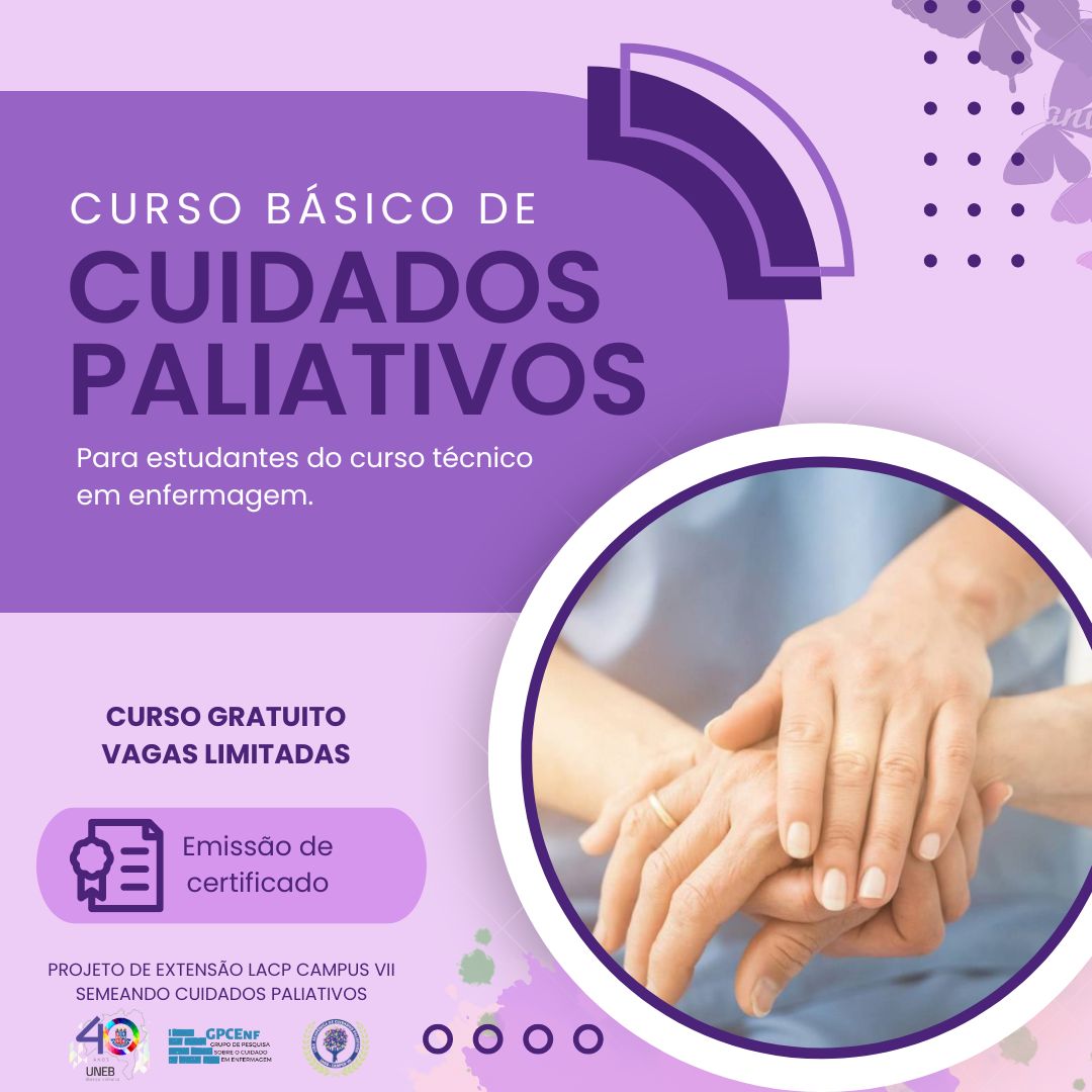 DEDCVII Inscrição - 29/11/2023 à 13/12/2023Curso Básico de Cuidados Paliativos Público alvo: Membro da LACPU – UNEB Campus VII Local: Universidade do Estado da Bahia Carga horária: 20h (5 h semanais) Horário: Presencial: 13:30 – 17:30 CRONOGRAMA 1° encontro 01/12/2023 (sexta-feira) - Apresentação do programa do curso - (30 min) - Dinâmica Cartas na mesa - (60 min) - Dinâmica com leitura e discussão de textos jornalísticos sobre o morrer e a morte (leitura e discussão) - (90 min) - O que são Cuidados Paliativos – dinâmica da representação social a dinâmica do guarda-chuva (60 min) 13:30 – 17:30 (4 h) Atividade Individual (2 h) 2° encontro 05/12/2023 (terça-feira) - Exibição e discussão do documentário “A partida final” ASSÍNCRONA Atividade Individual (4 h) 3° encontro 06/12/2023 (quarta-feira) - É possível aprender a morrer? Reflexões sobre a finitude humana. Participação no evento sobre Tanatologia - IF BAIANO 13:30 – 17:30 (5 h) 4° encontro 08/12/2023 (sexta-feira) - Controle de sintomas e o uso das escalas para avaliação - (60 min) - O uso da via subcutânea - (60 min) - Demonstração prática do uso da via subcutânea e hipodermóclise - (60 min) - Confraternização da Liga (LACPU) (60 min) 13:30 – 18:30 (5 h)